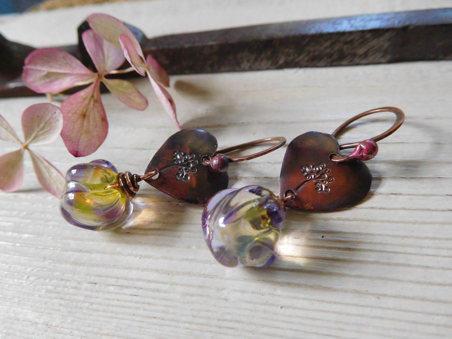 Boucles d'oreilles bohèmes avec perles en verre filé au chalumeau, modèle unique créé dans mon atelier en Finistère.