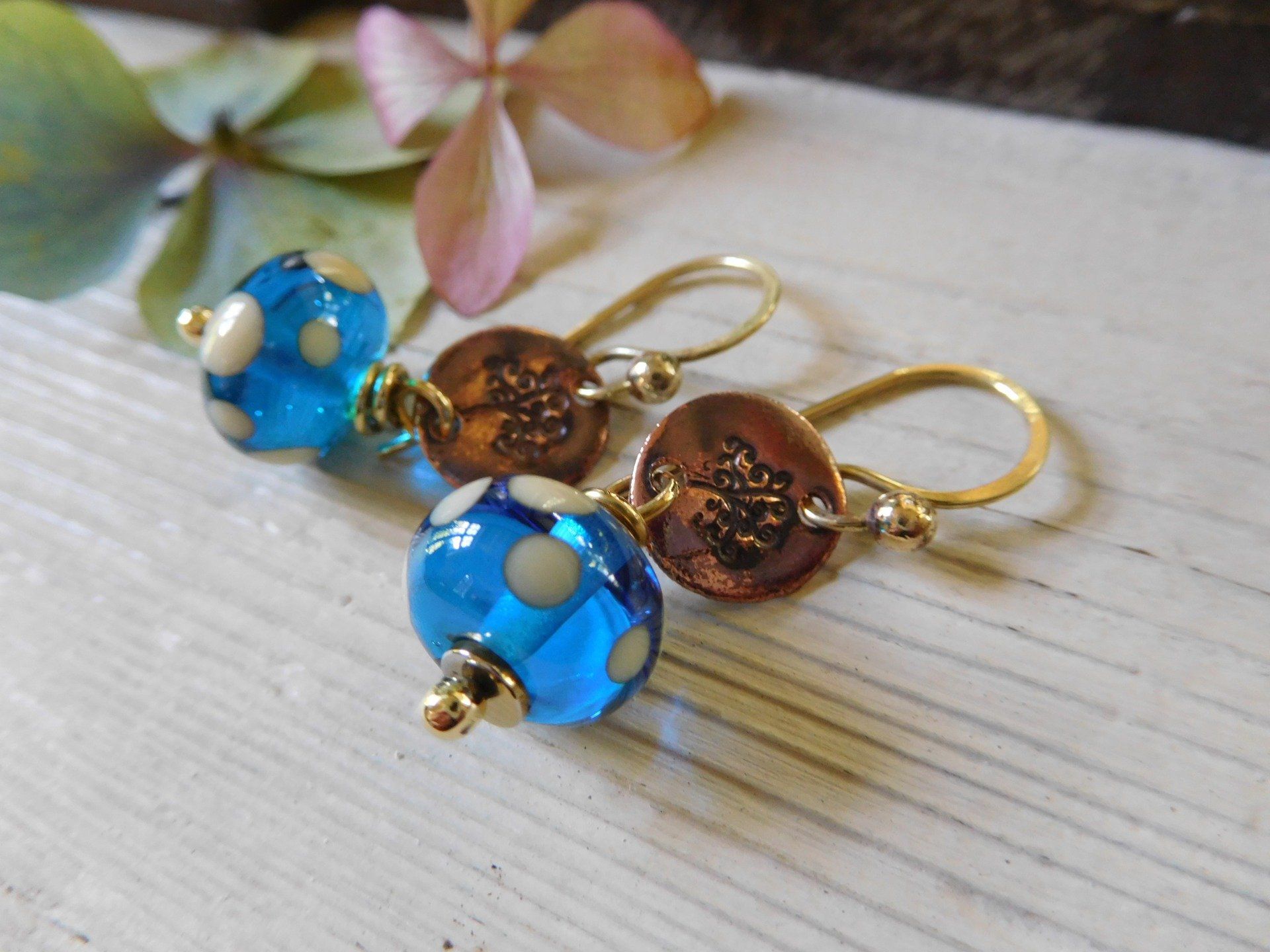 Boucles d'oreilles bohèmes avec perles en verre filé au chalumeau, modèle unique créé dans mon atelier en Finistère.
