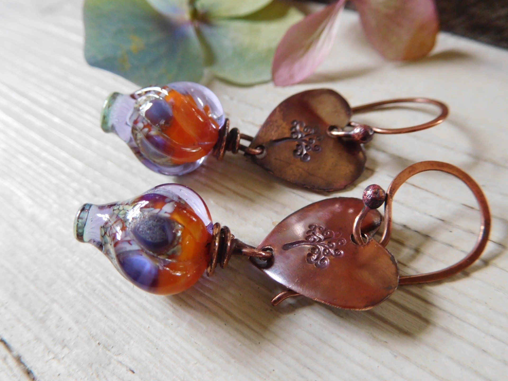 Boucles d'oreilles bohèmes avec perles en verre filé au chalumeau, modèle unique créé dans mon atelier en Finistère.