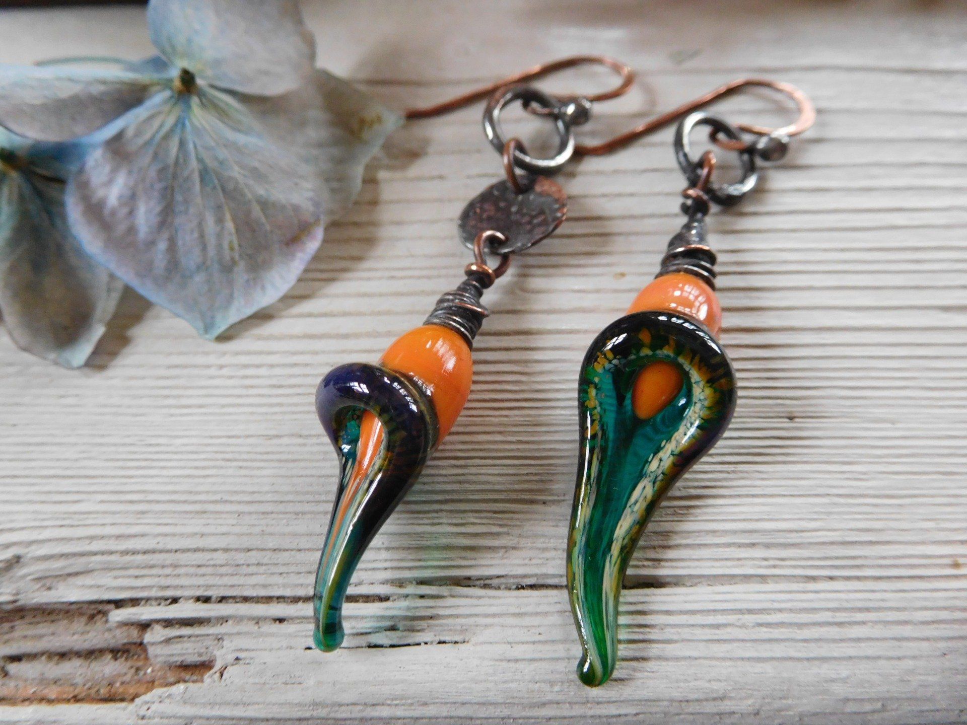 Boucles d'oreilles bohèmes avec perles en verre filé au chalumeau, modèle unique créé dans mon atelier en Finistère.