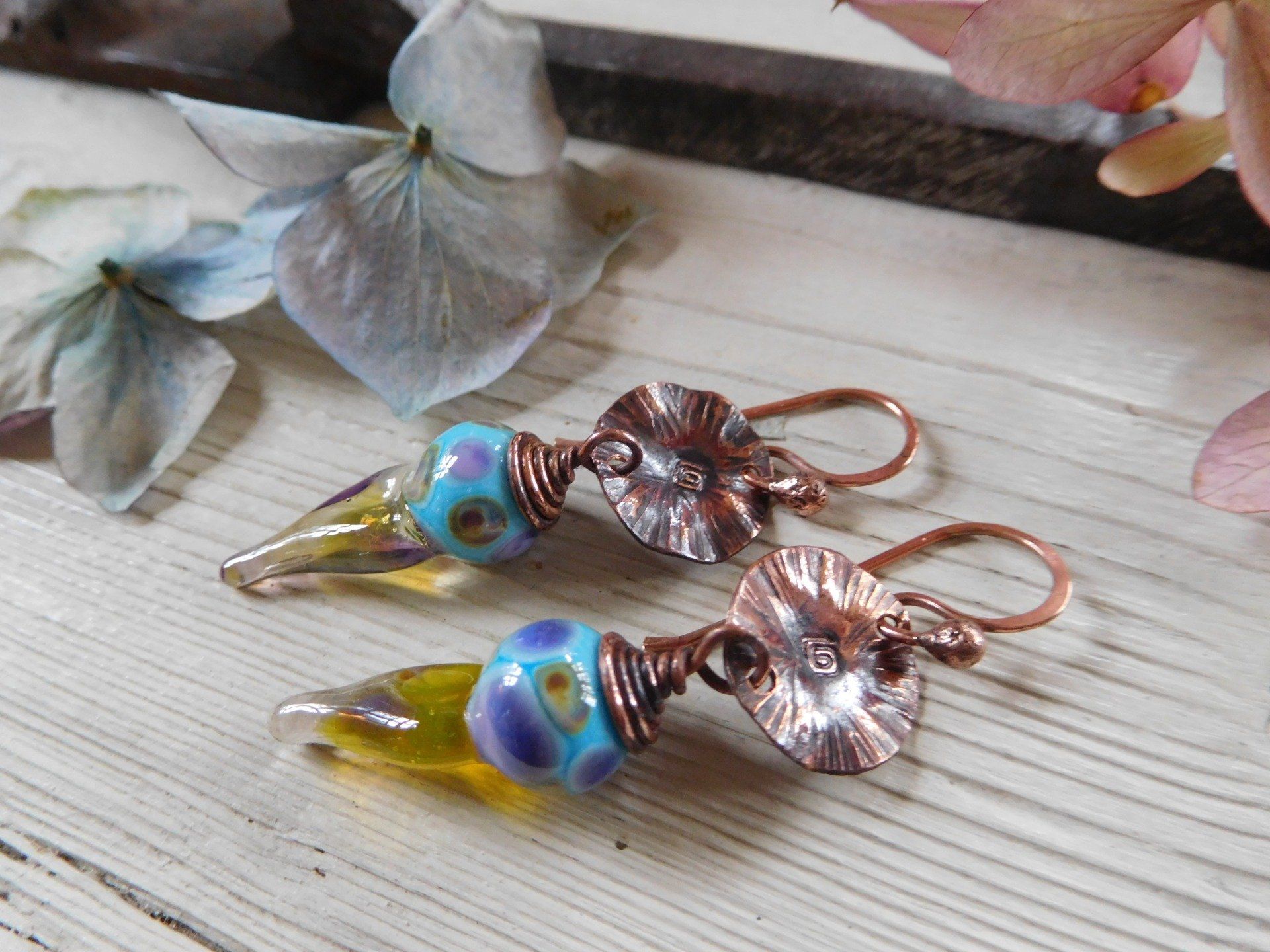 Boucles d'oreilles bohèmes avec perles en verre filé au chalumeau, modèle unique créé dans mon atelier en Finistère.