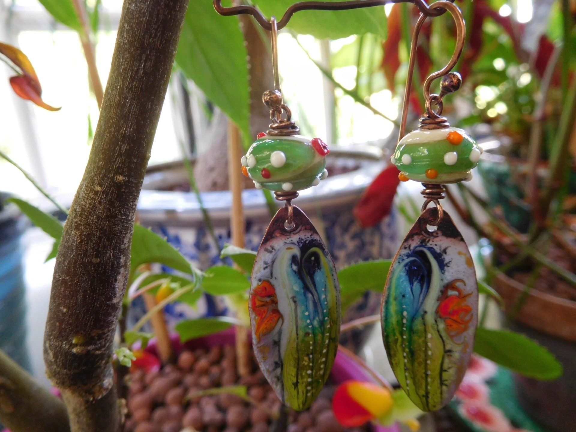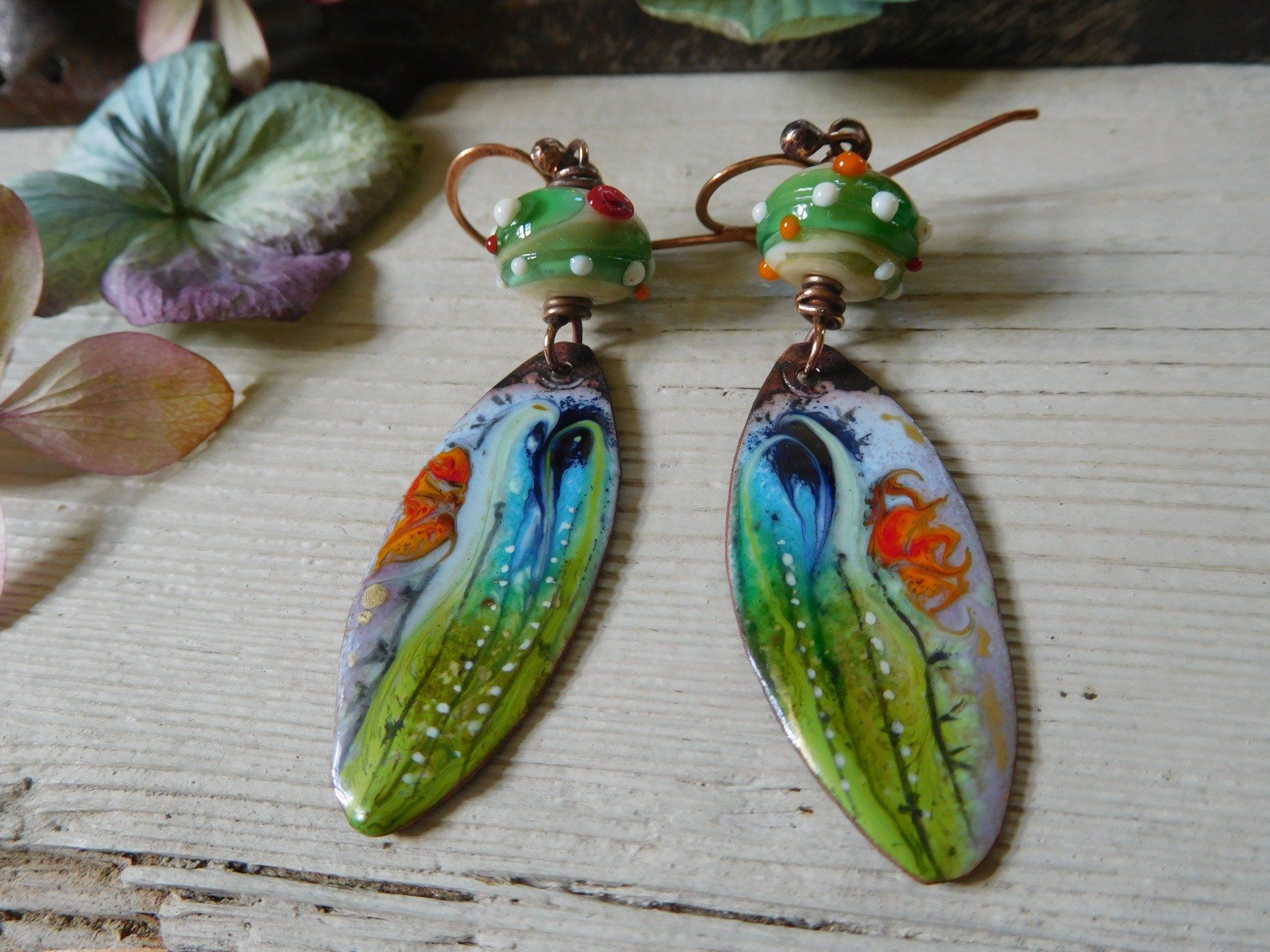 Boucles d'oreilles bohèmes en cuivre émaillé et perles en verre filé au chalumeau, modèle unique créé dans mon atelier en Finistère.