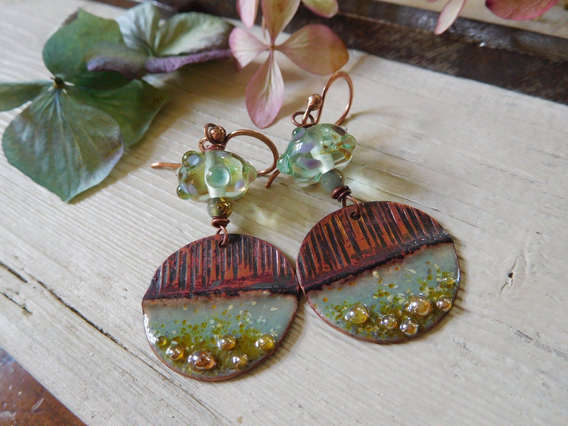 Boucles d'oreilles bohèmes en cuivre émaillé et perles en verre filé au chalumeau, modèle unique créé dans mon atelier en Finistère.