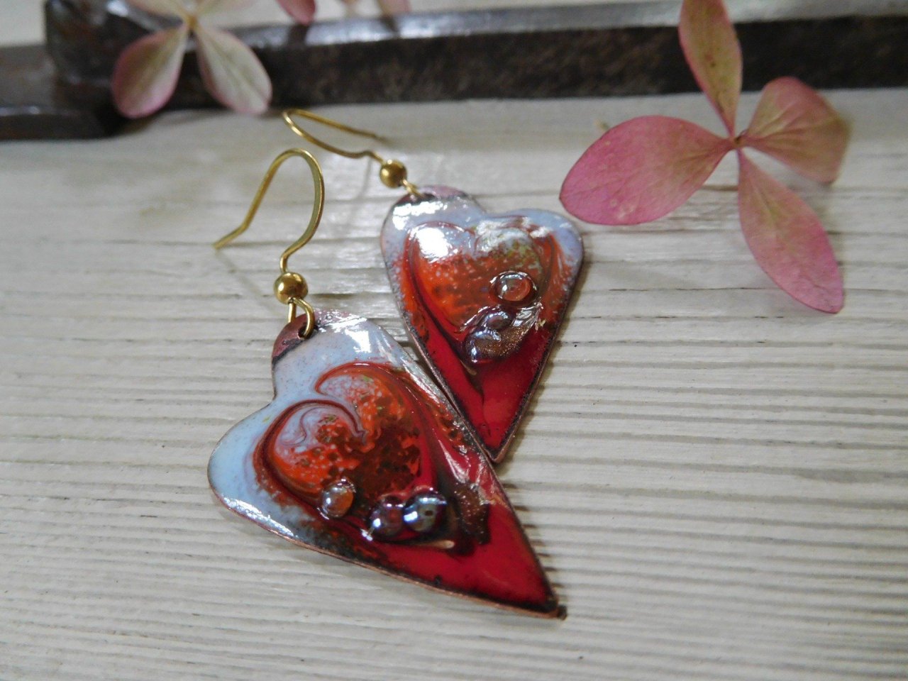 Emaux sur cuivre en forme de coeurs.