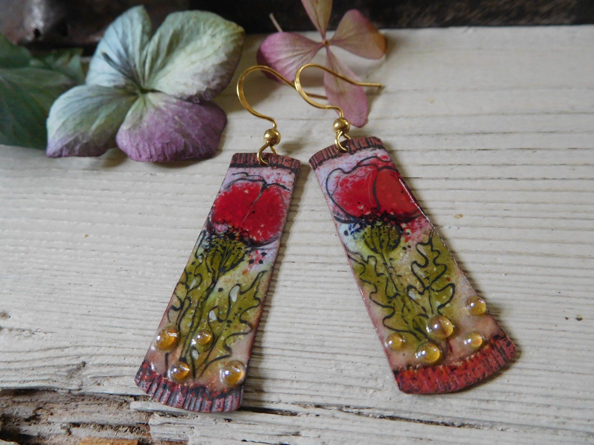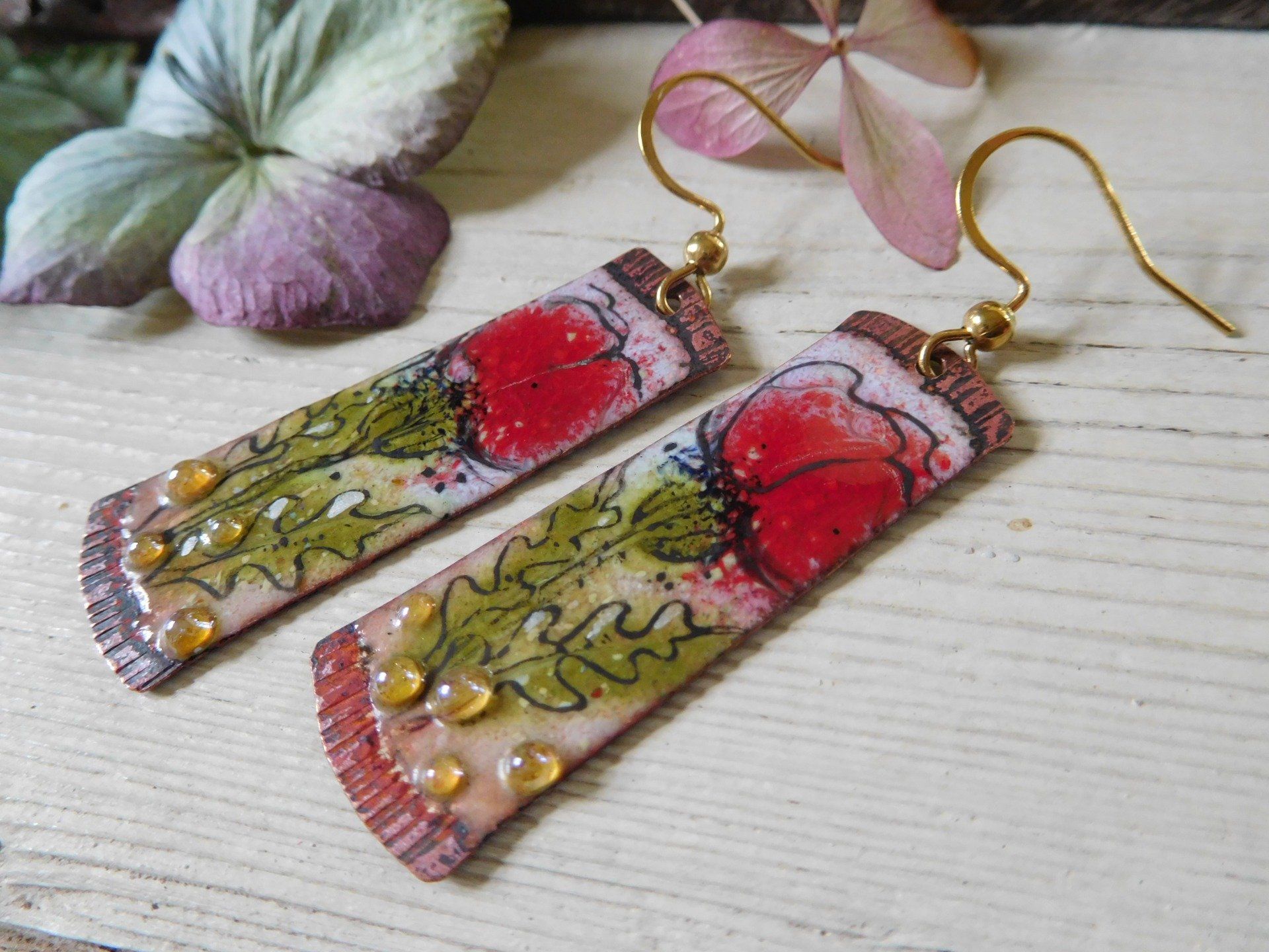 Boucles d'oreilles bohèmes en cuivre émaillé, modèle unique créé dans mon atelier en Finistère.