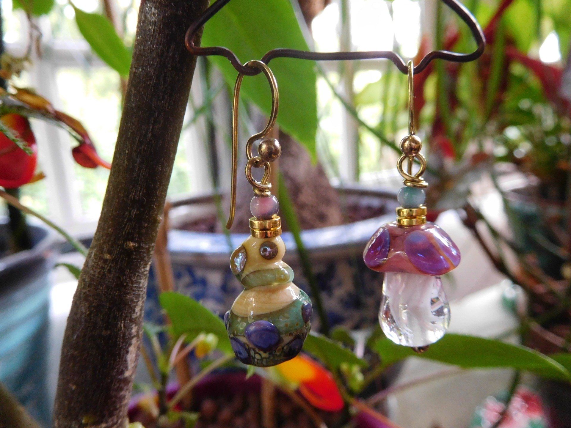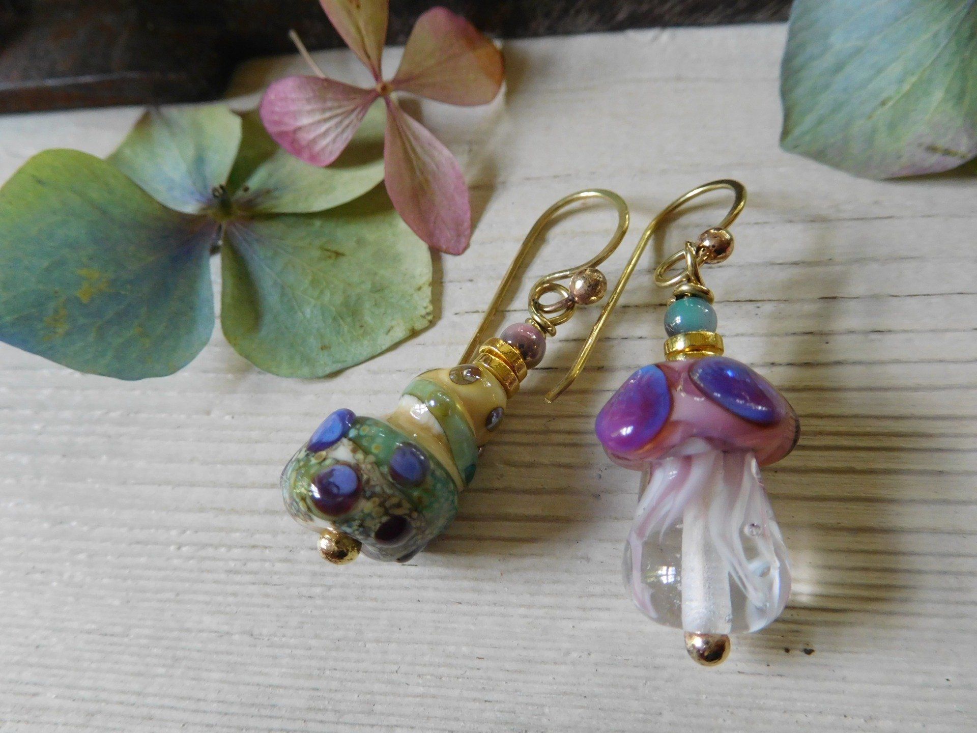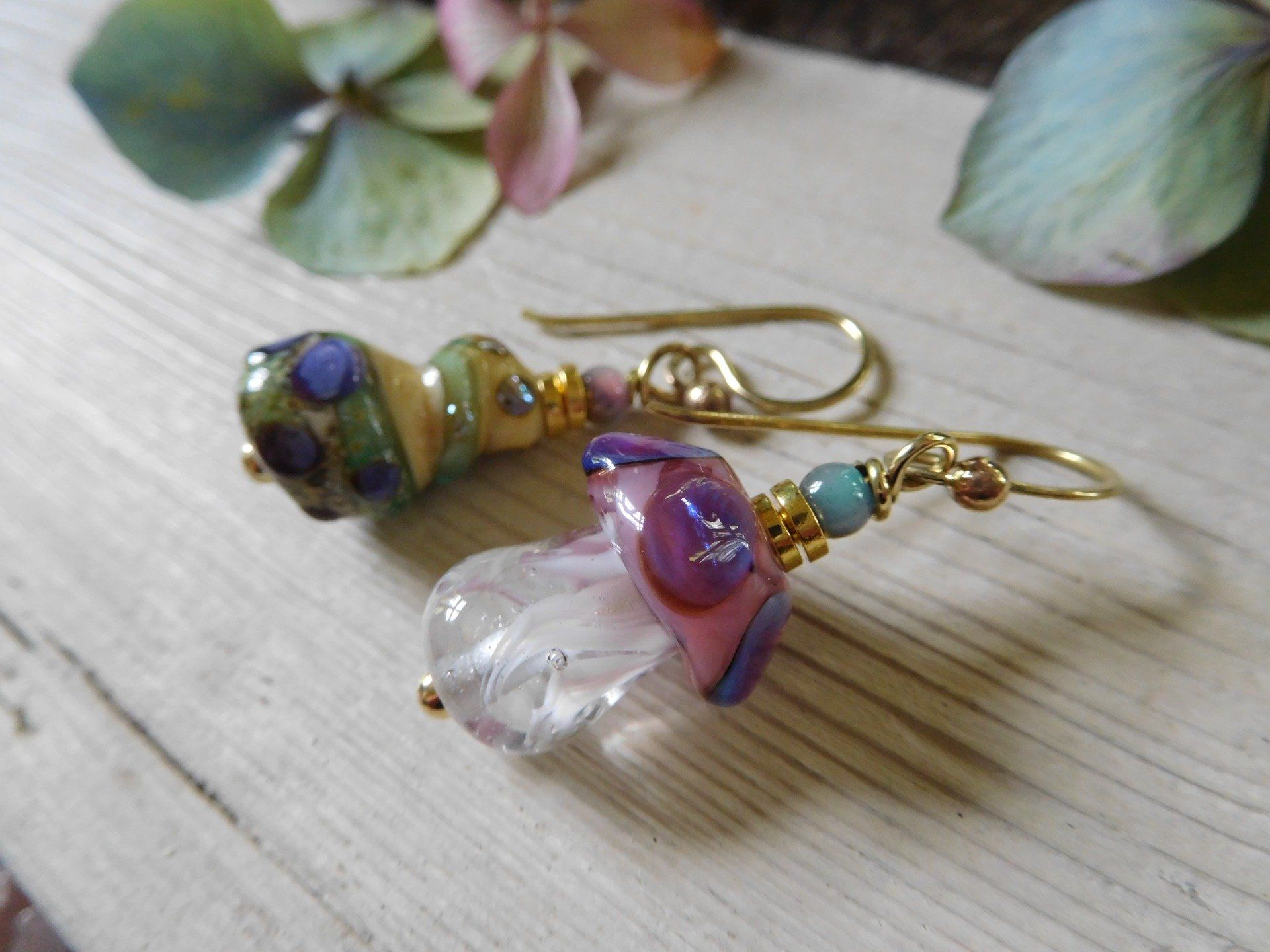 Boucles d'oreilles bohèmes avec perles en verre filé au chalumeau, modèle unique créé dans mon atelier en Finistère.