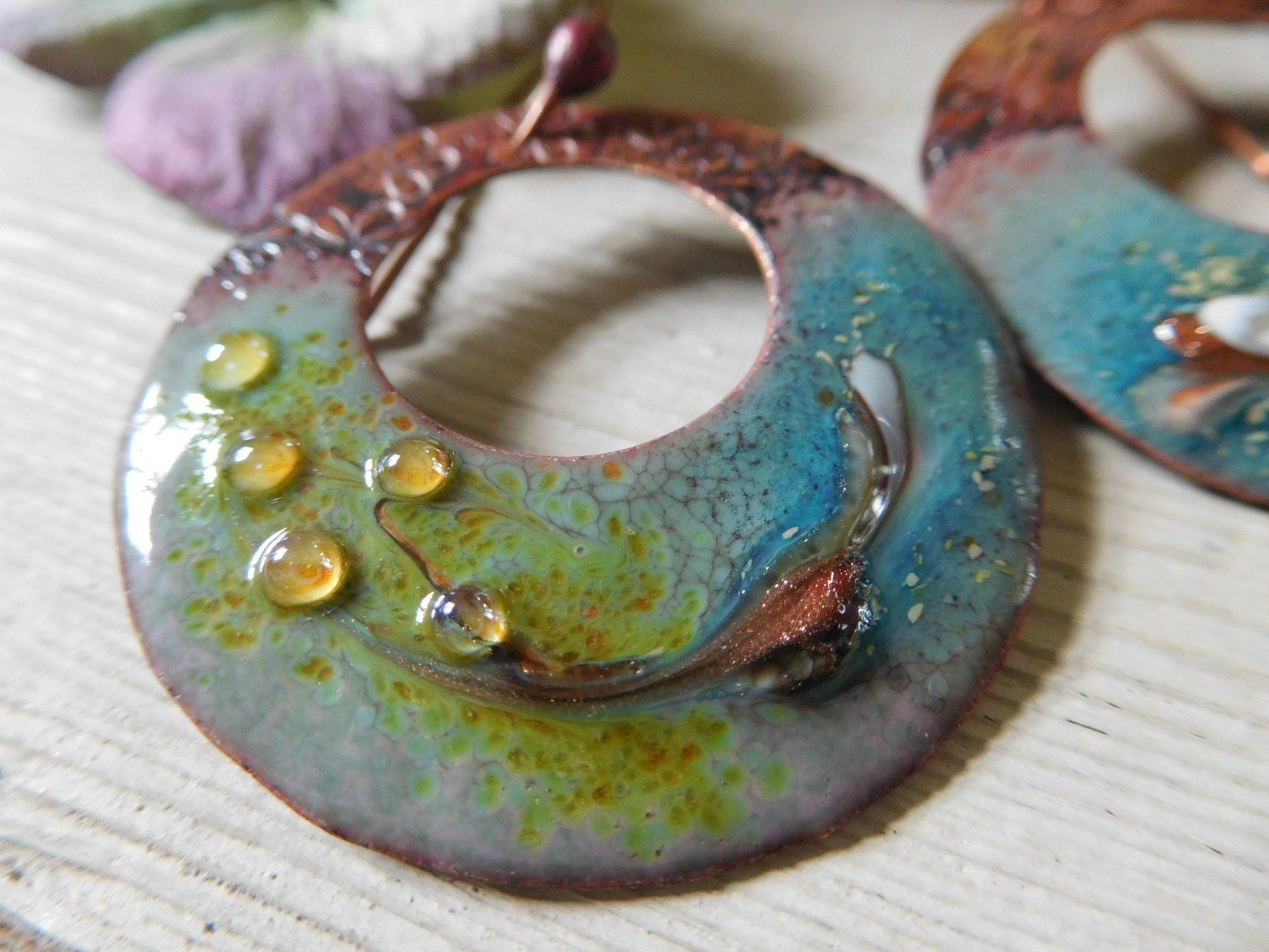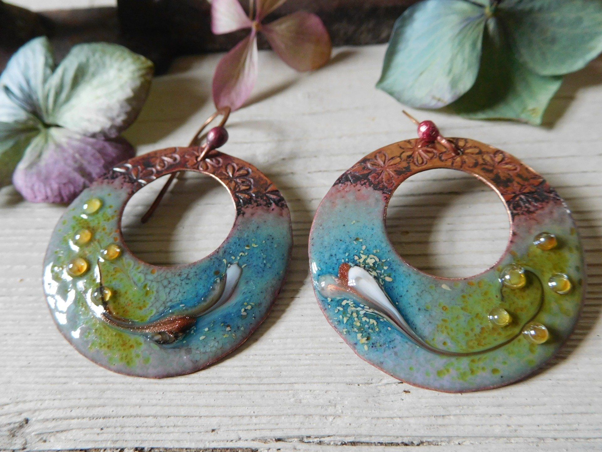 Boucles d'oreilles bohèmes en cuivre émaillé, modèle unique créé dans mon atelier en Finistère.