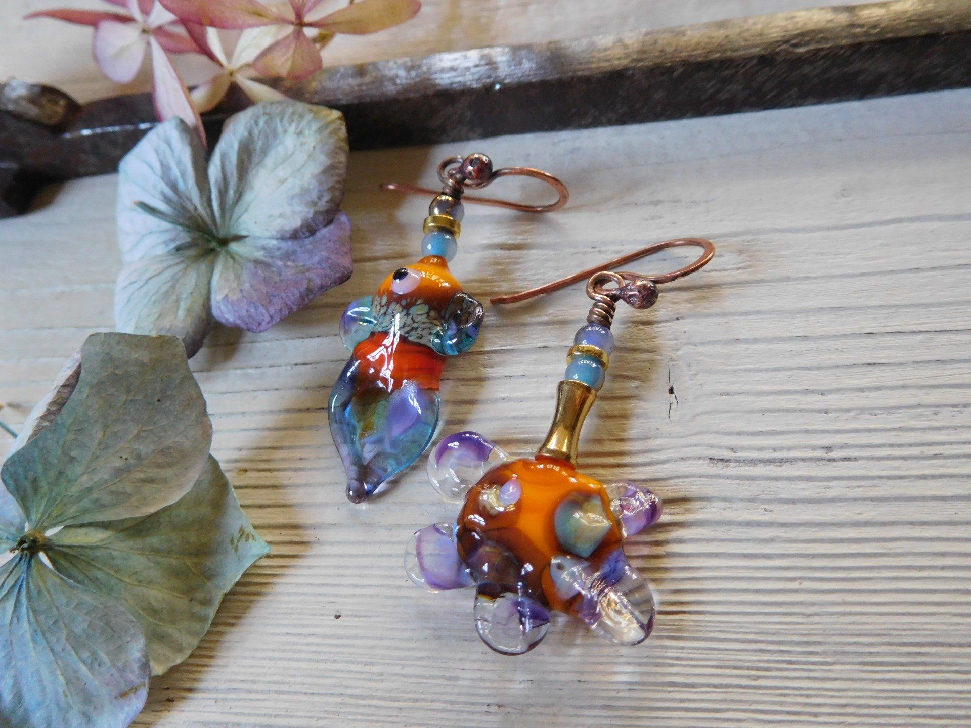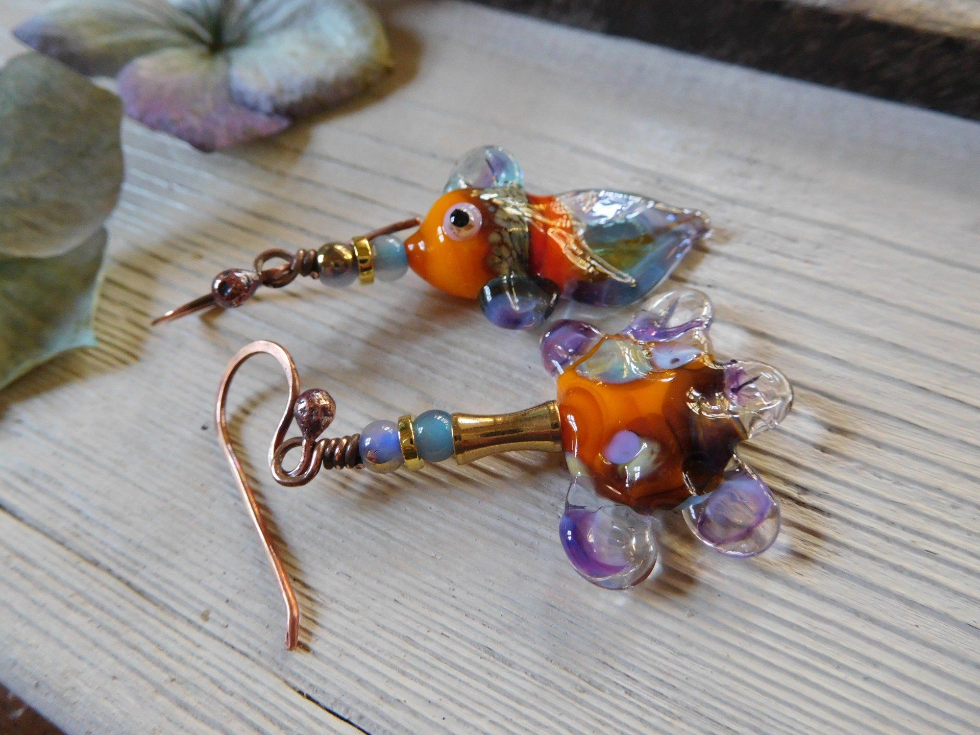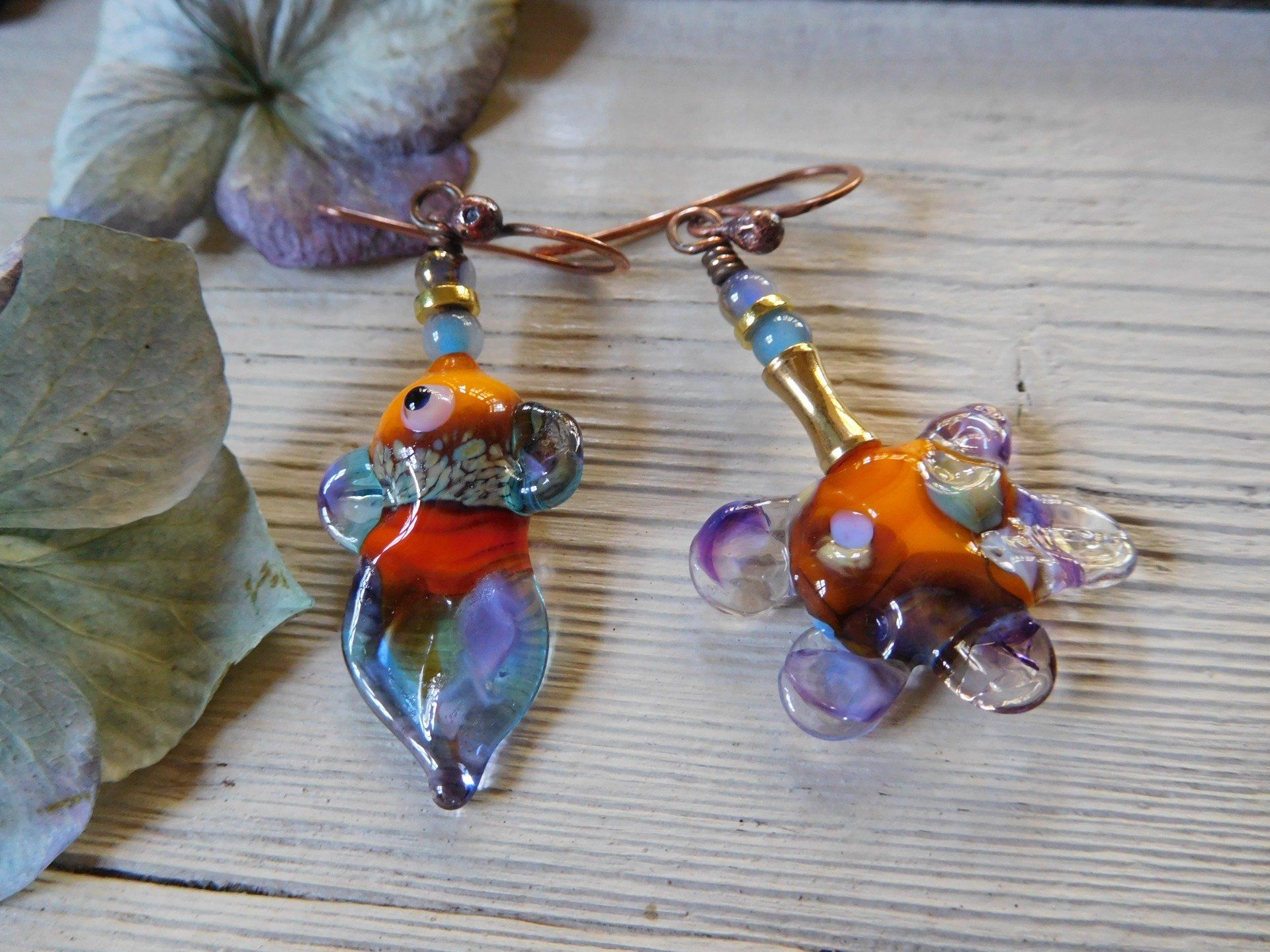 Perles en verre filé "poisson et fleur" sur fil de cuivre.