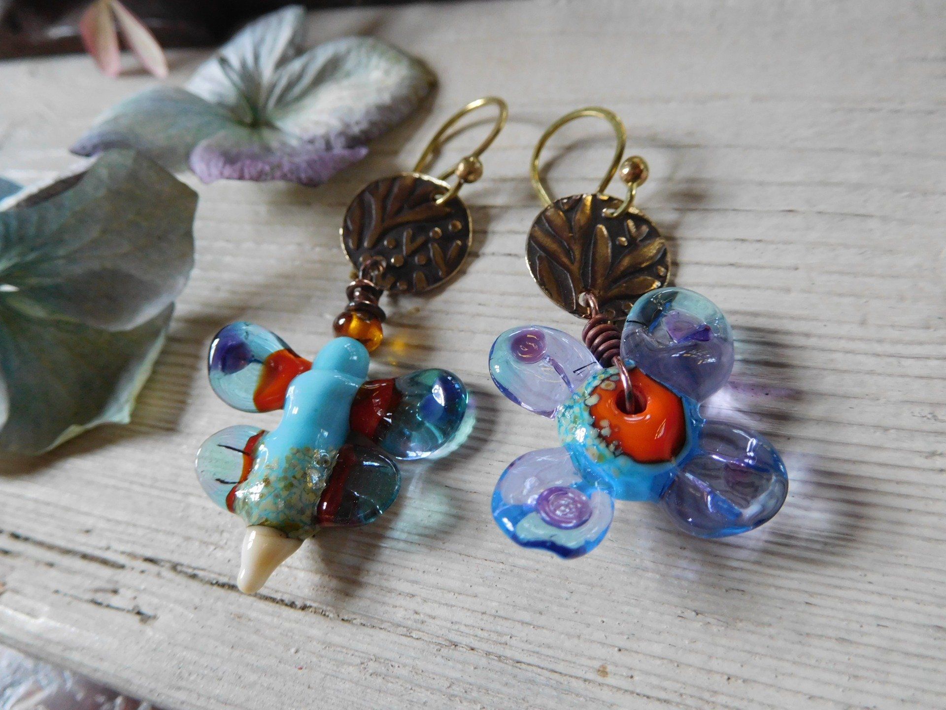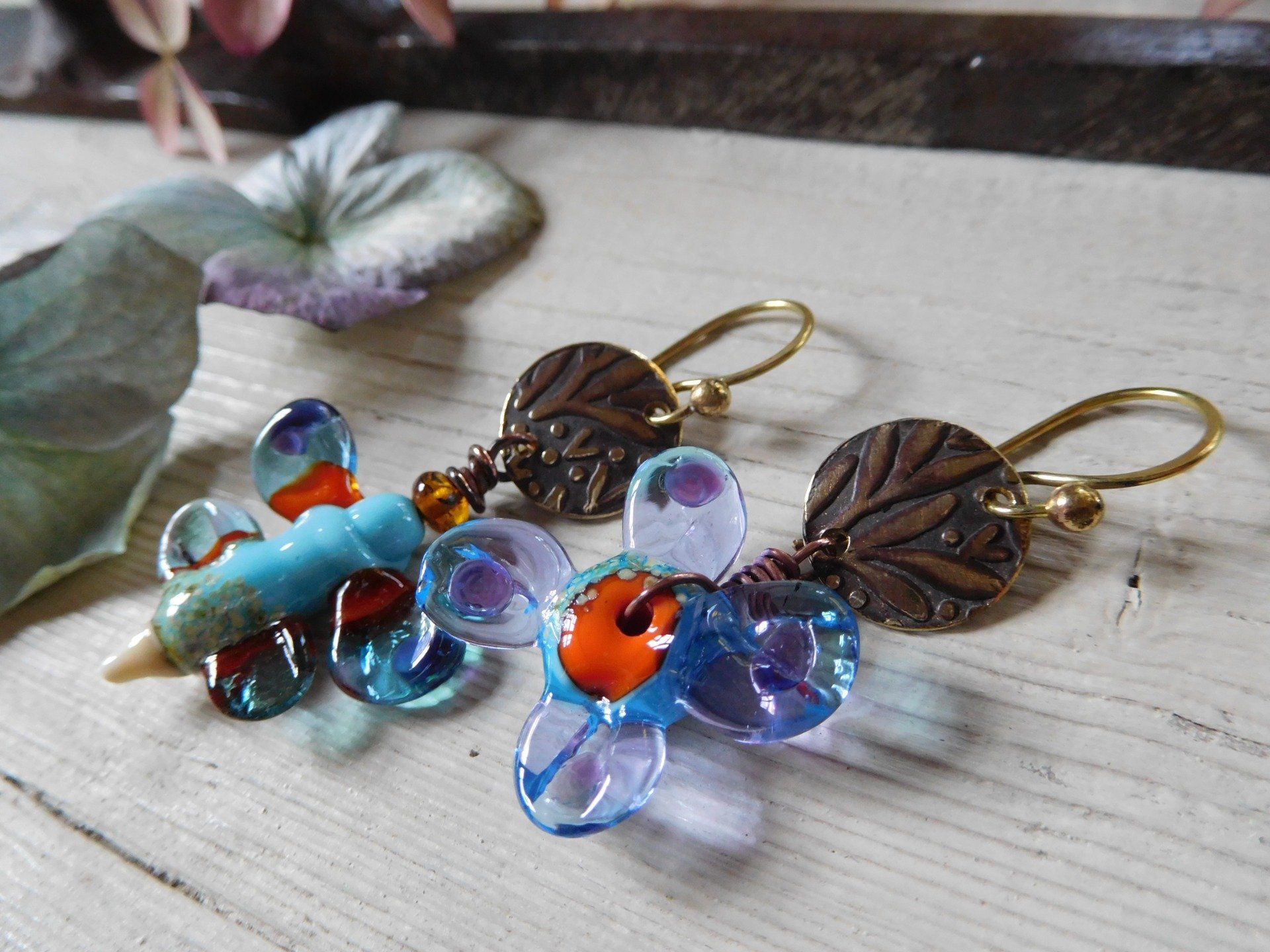 Boucles d'oreilles bohèmes avec perles en verre filé au chalumeau, modèle unique créé dans mon atelier en Finistère.