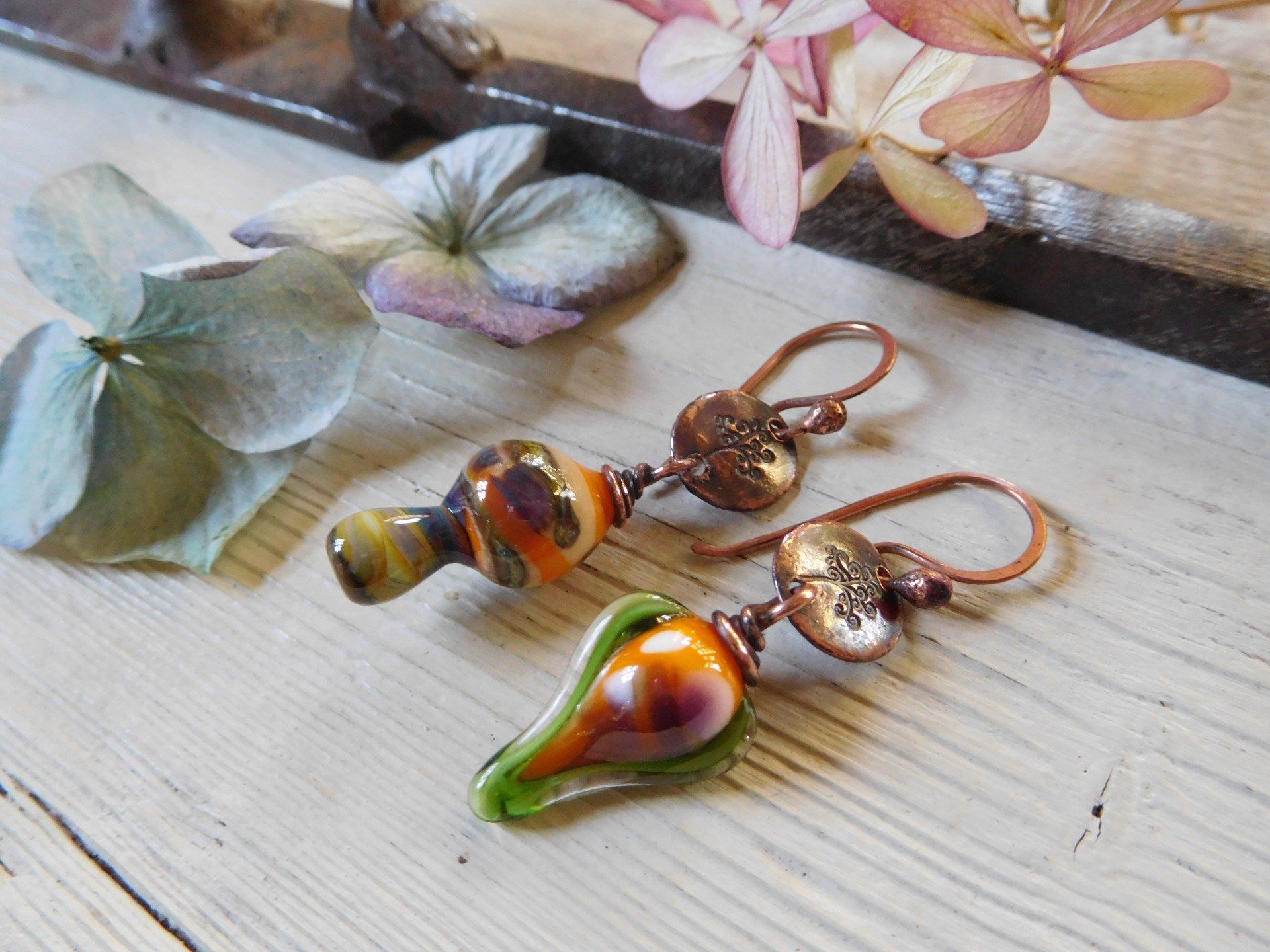 Boucles d'oreilles bohèmes avec perles en verre filé au chalumeau, modèle unique créé dans mon atelier en Finistère.