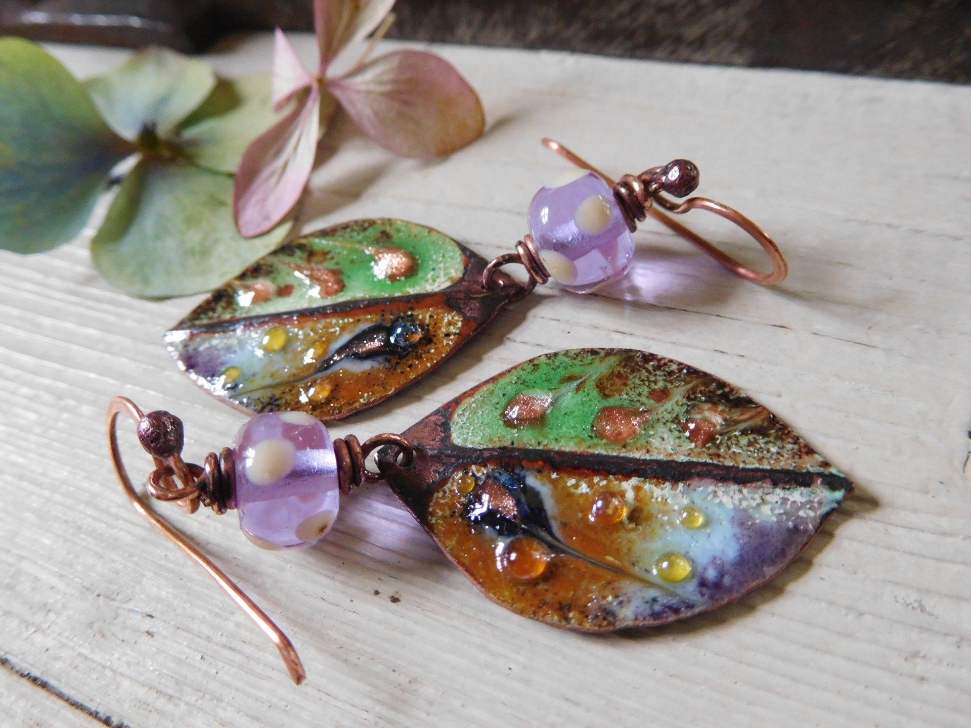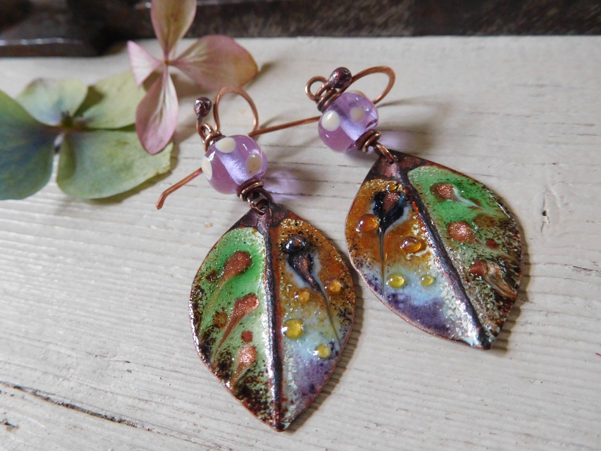 Boucles d'oreilles bohèmes en cuivre émaillé et perles en verre filé au chalumeau, modèle unique créé dans mon atelier en Finistère.