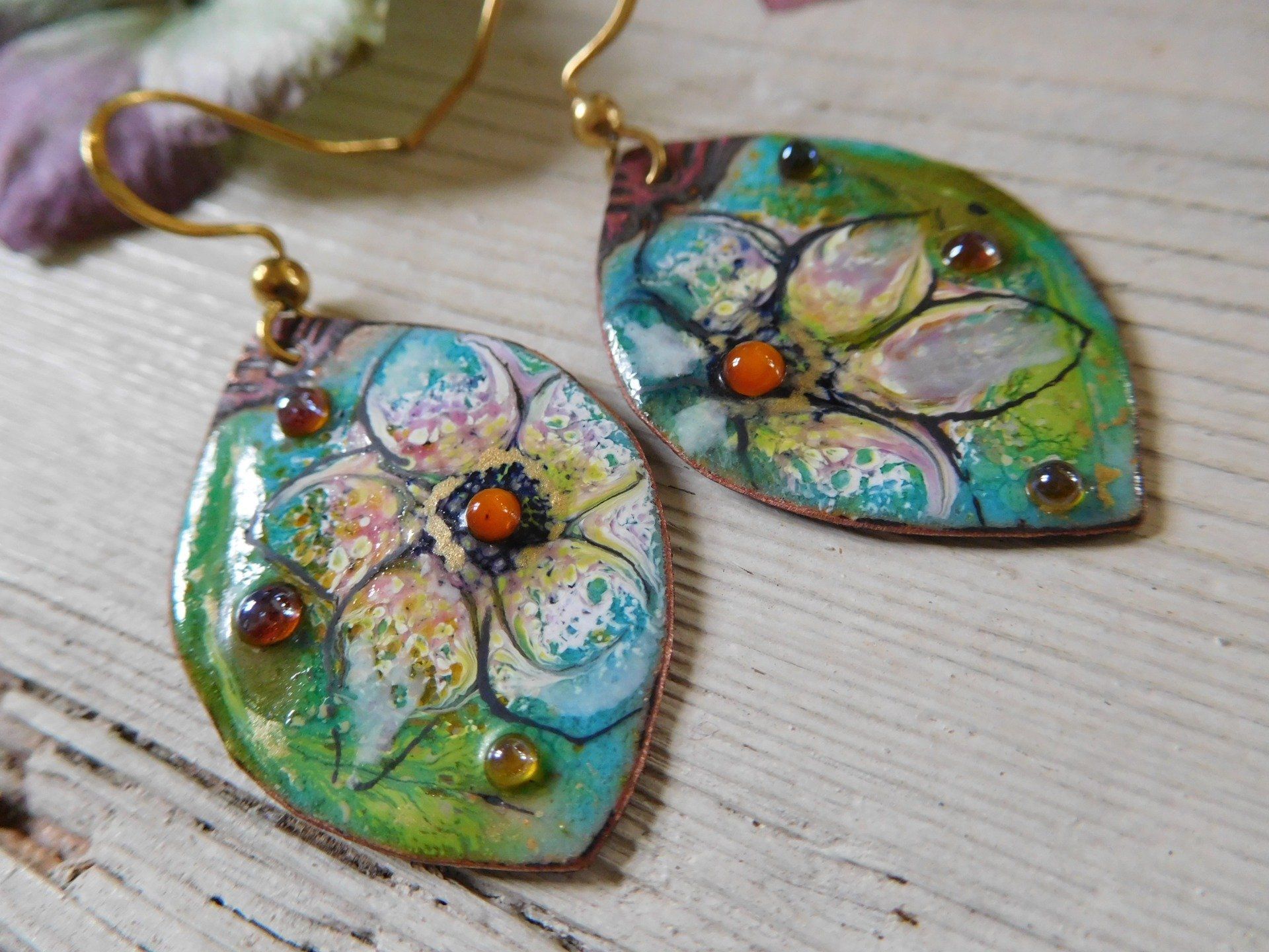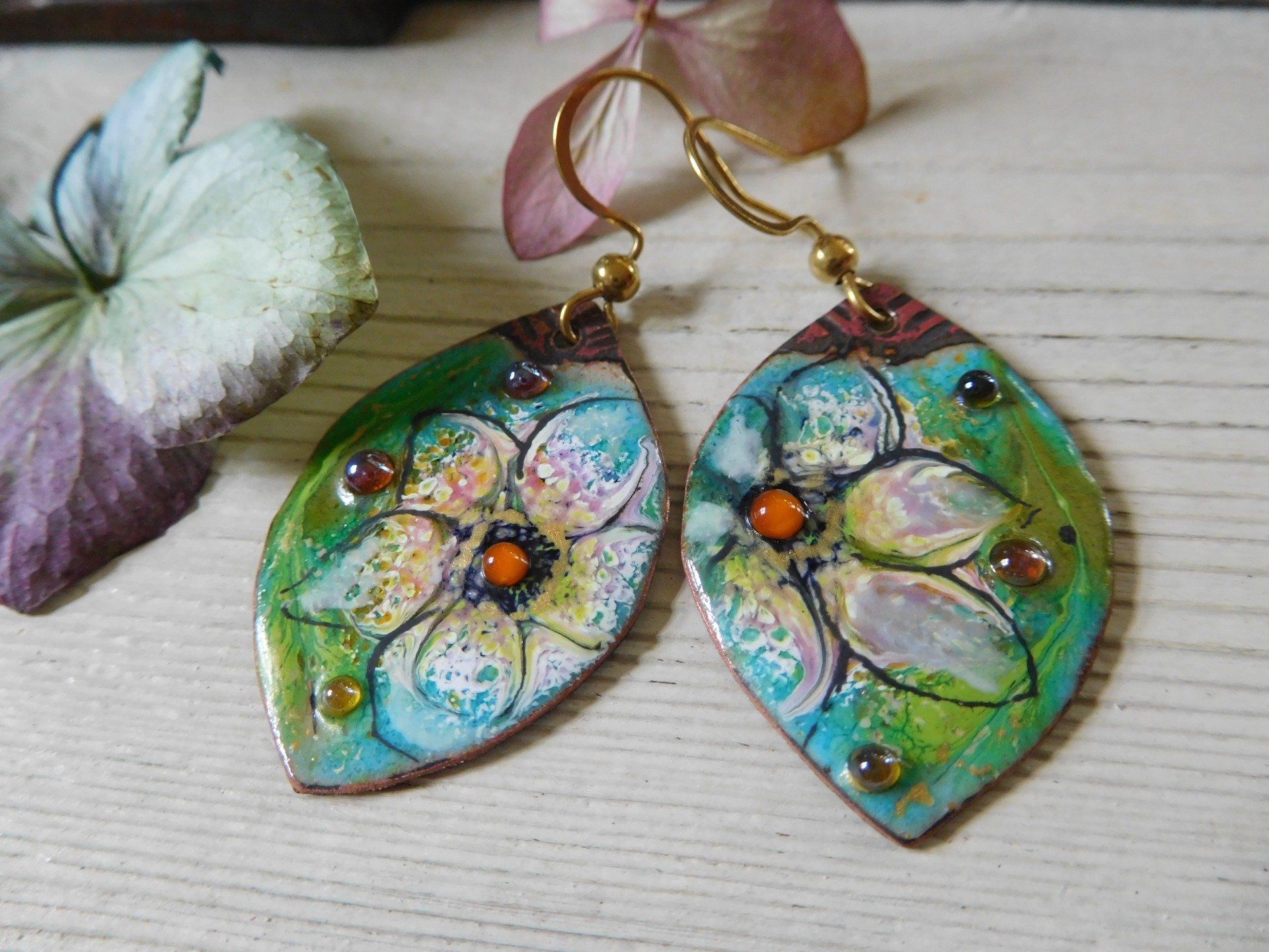 Boucles d'oreilles bohèmes en cuivre émaillé, modèle unique créé dans mon atelier en Finistère.