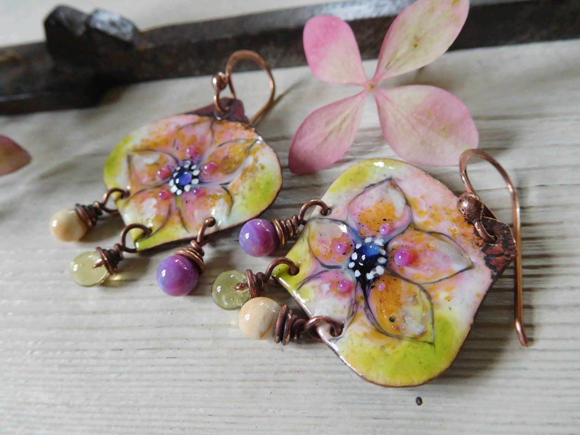 Boucles d'oreilles bohèmes en cuivre émaillé et perles en verre filé au chalumeau, modèle unique créé dans mon atelier en Finistère.