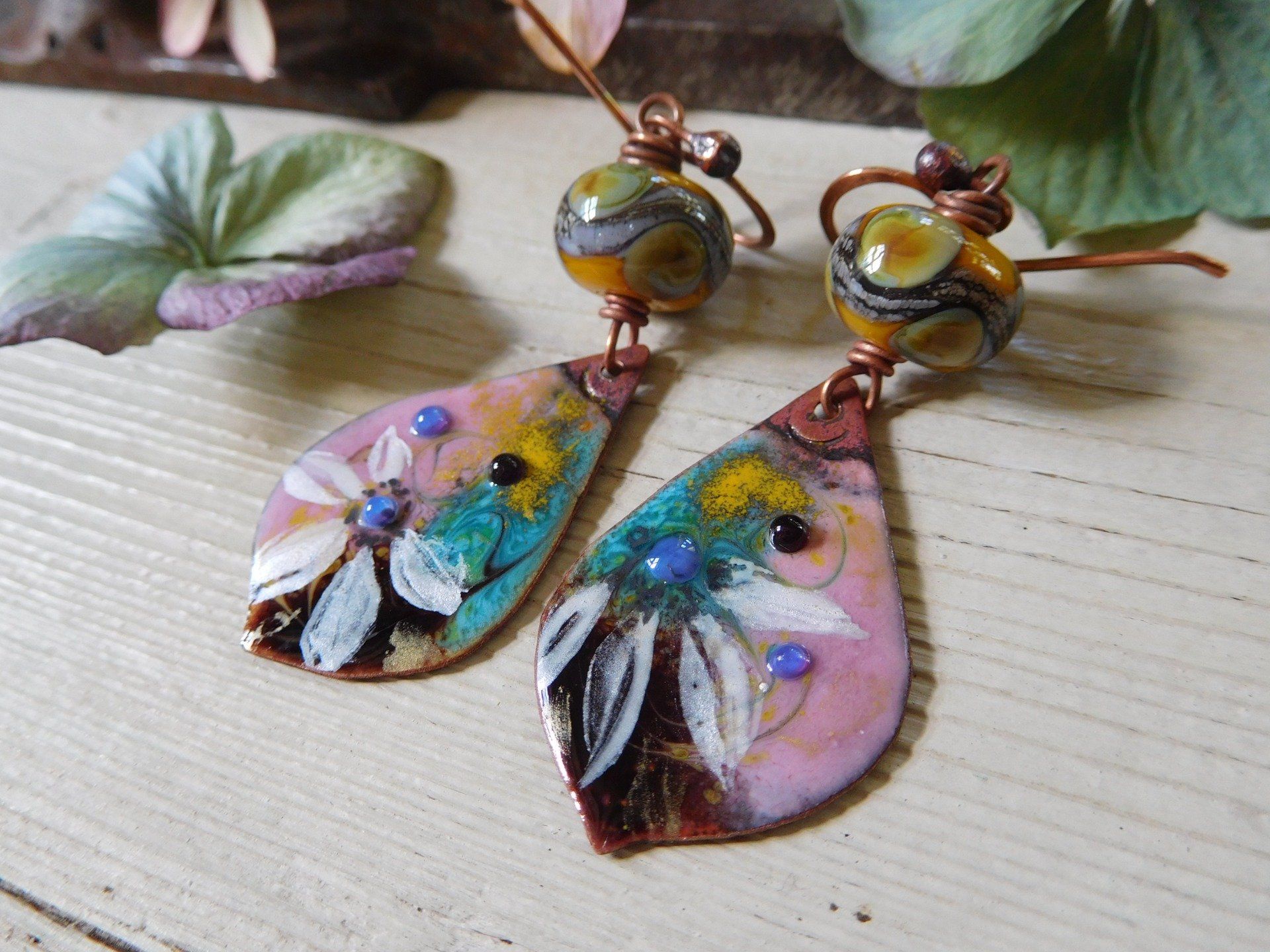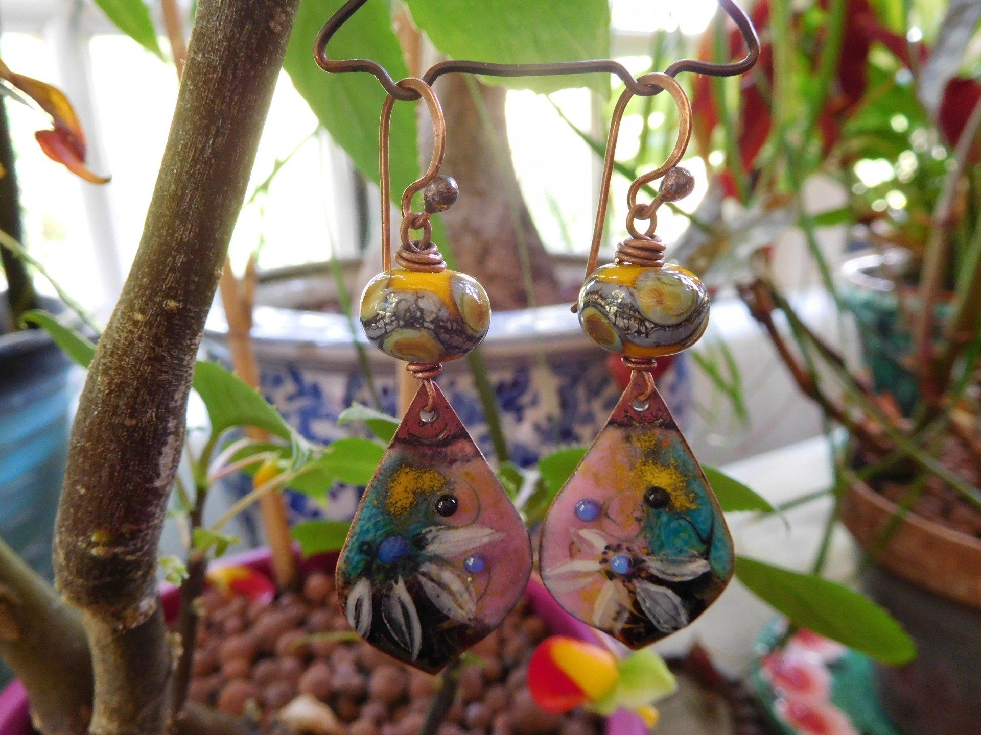 Boucles d'oreilles bohèmes en cuivre émaillé et perles en verre filé au chalumeau, modèle unique créé dans mon atelier en Finistère.