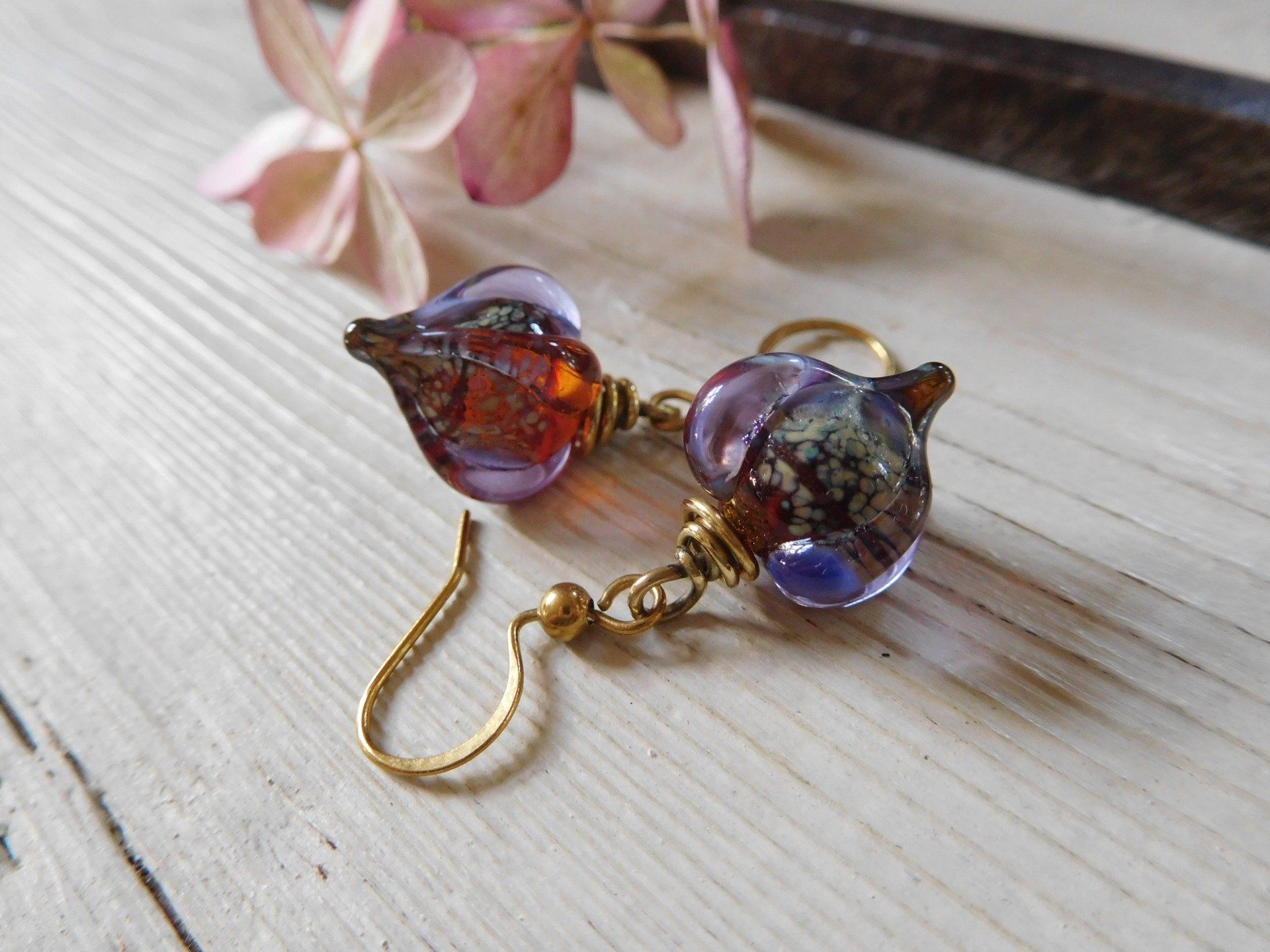 Boucles d'oreilles bohèmes avec perles en verre filé au chalumeau, modèle unique créé dans mon atelier en Finistère.