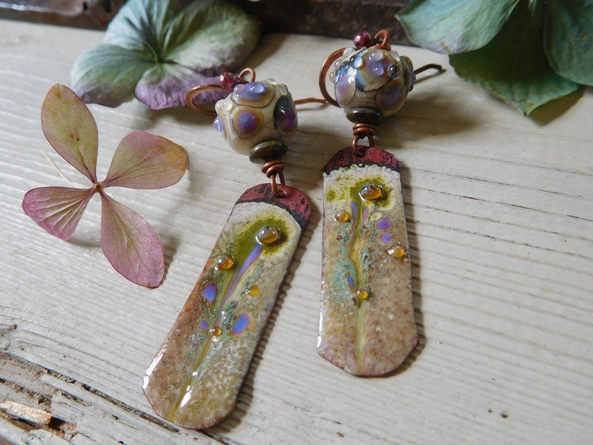 Boucles d'oreilles bohèmes en cuivre émaillé et perles en verre filé au chalumeau, modèle unique créé dans mon atelier en Finistère.