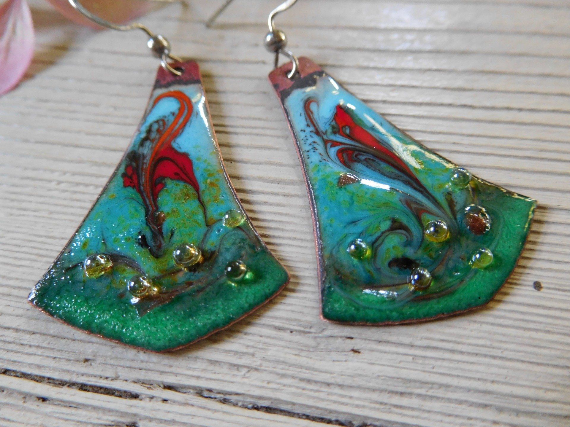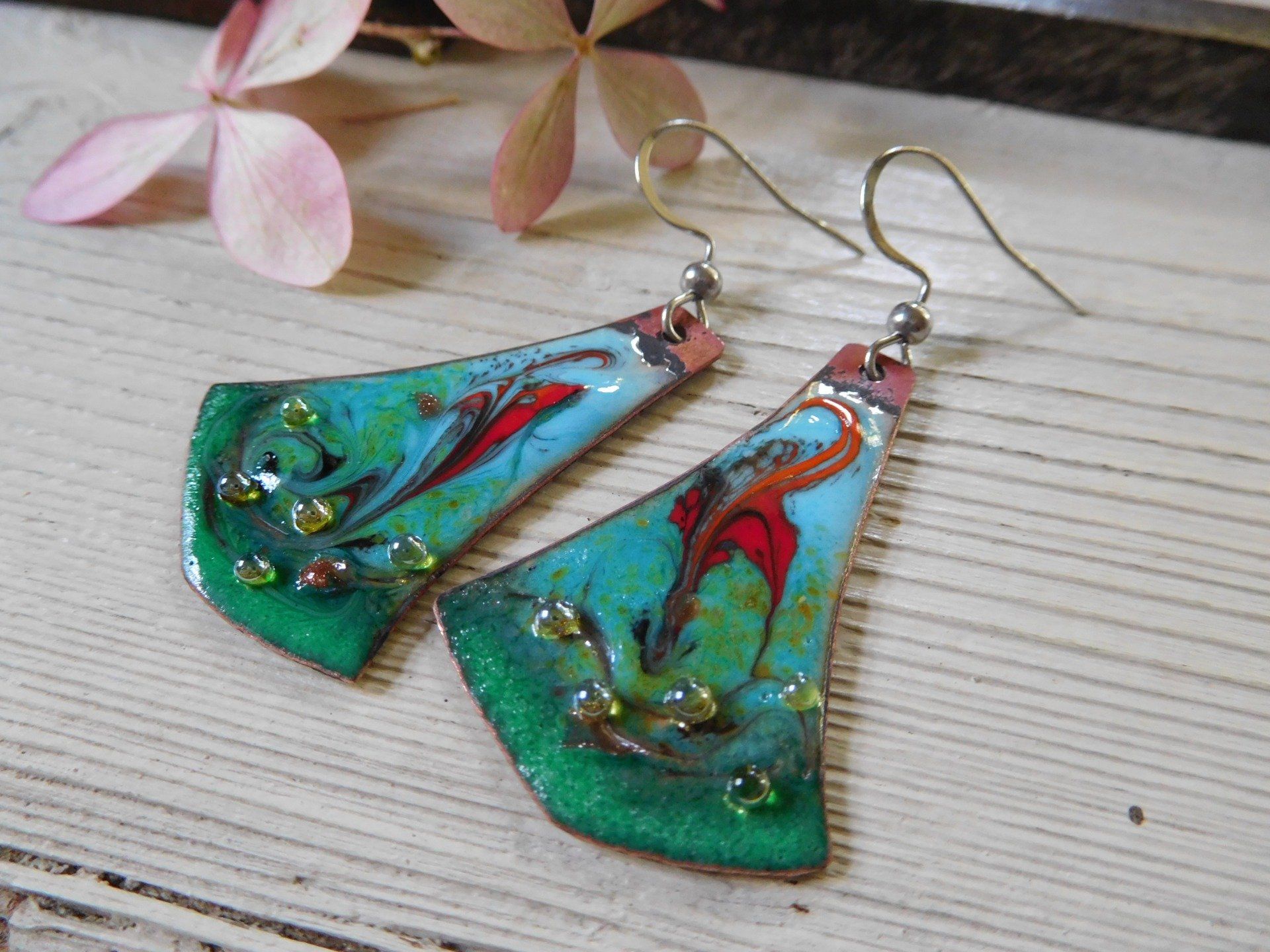Boucles d'oreilles bohèmes en cuivre émaillé, modèle unique créé dans mon atelier en Finistère.