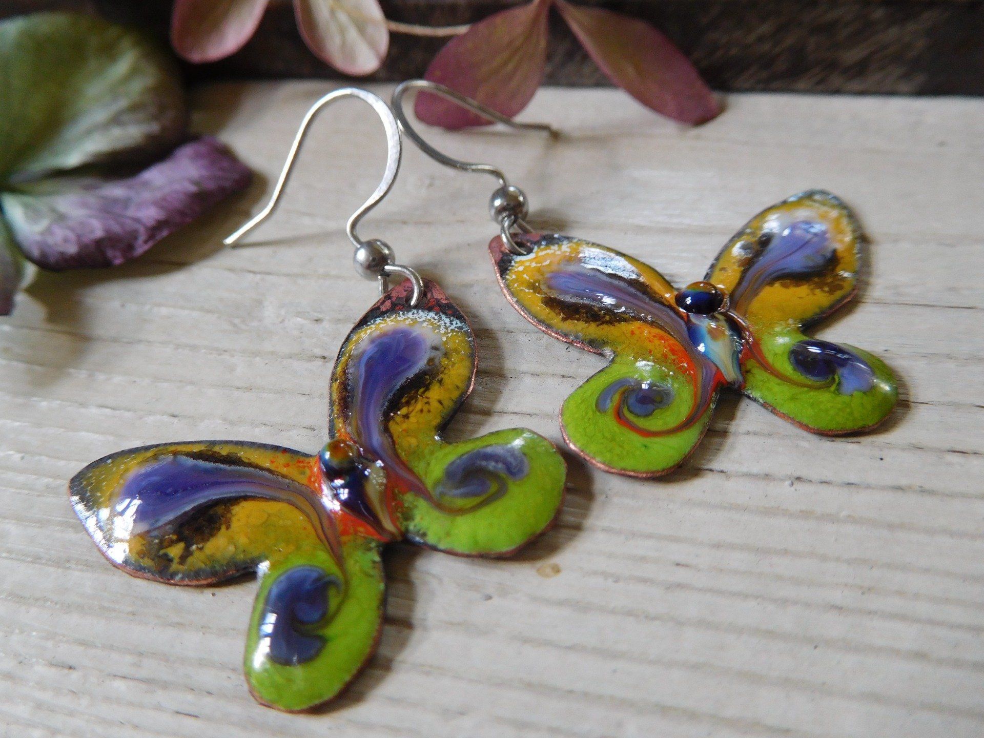 Boucles d'oreilles bohèmes en cuivre émaillé, modèle unique créé dans mon atelier en Finistère.