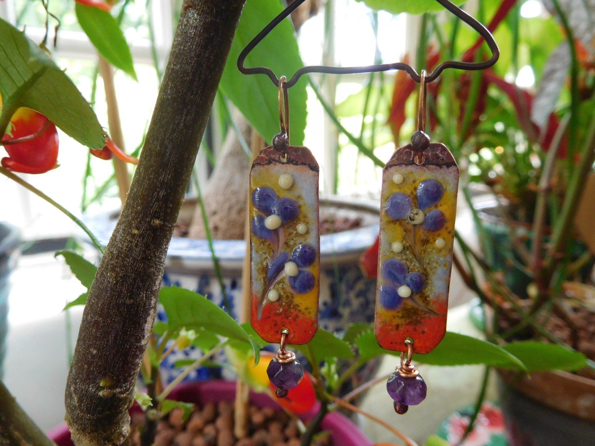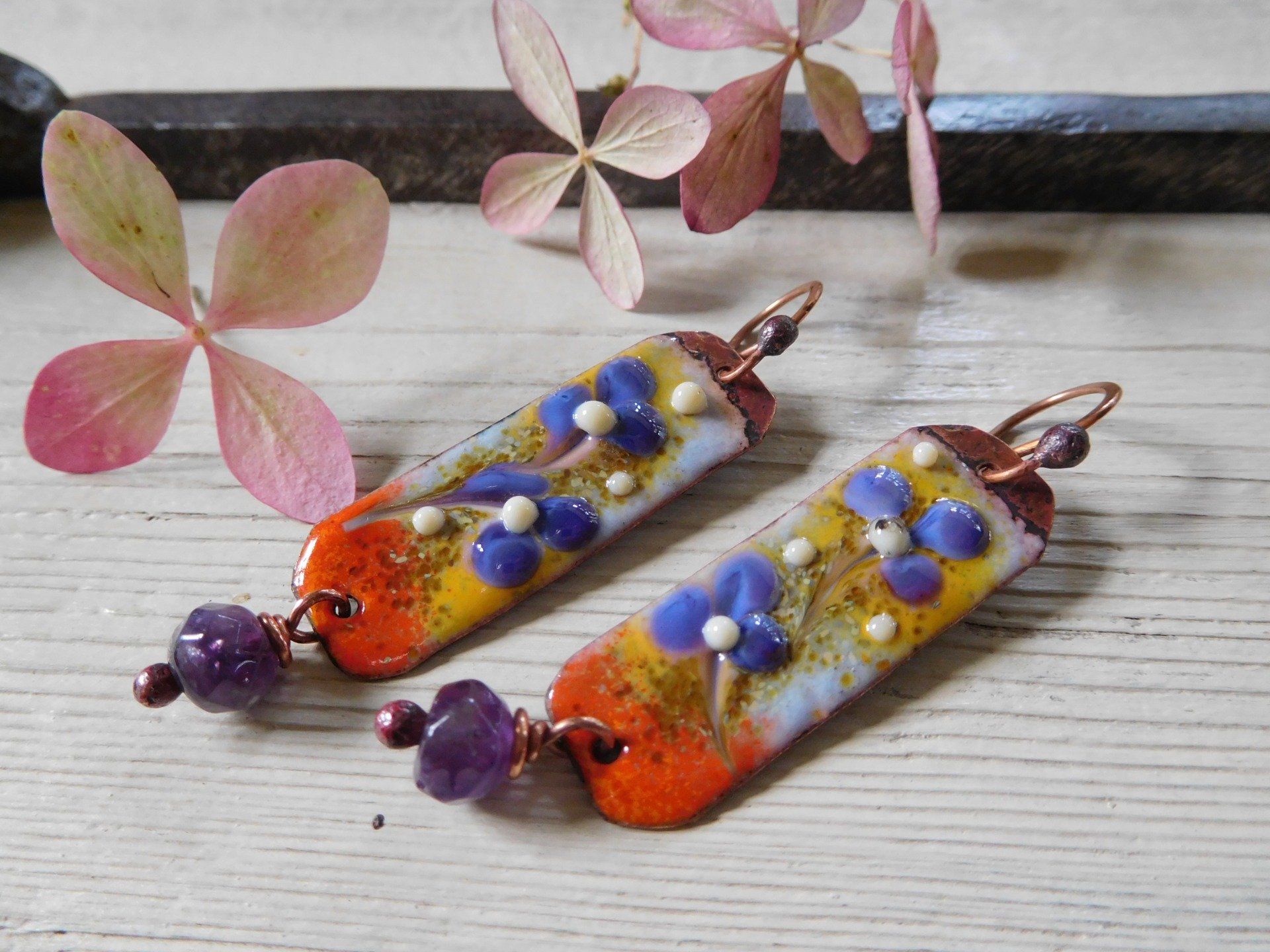 Boucles d'oreilles bohèmes en cuivre émaillé, modèle unique créé dans mon atelier en Finistère.