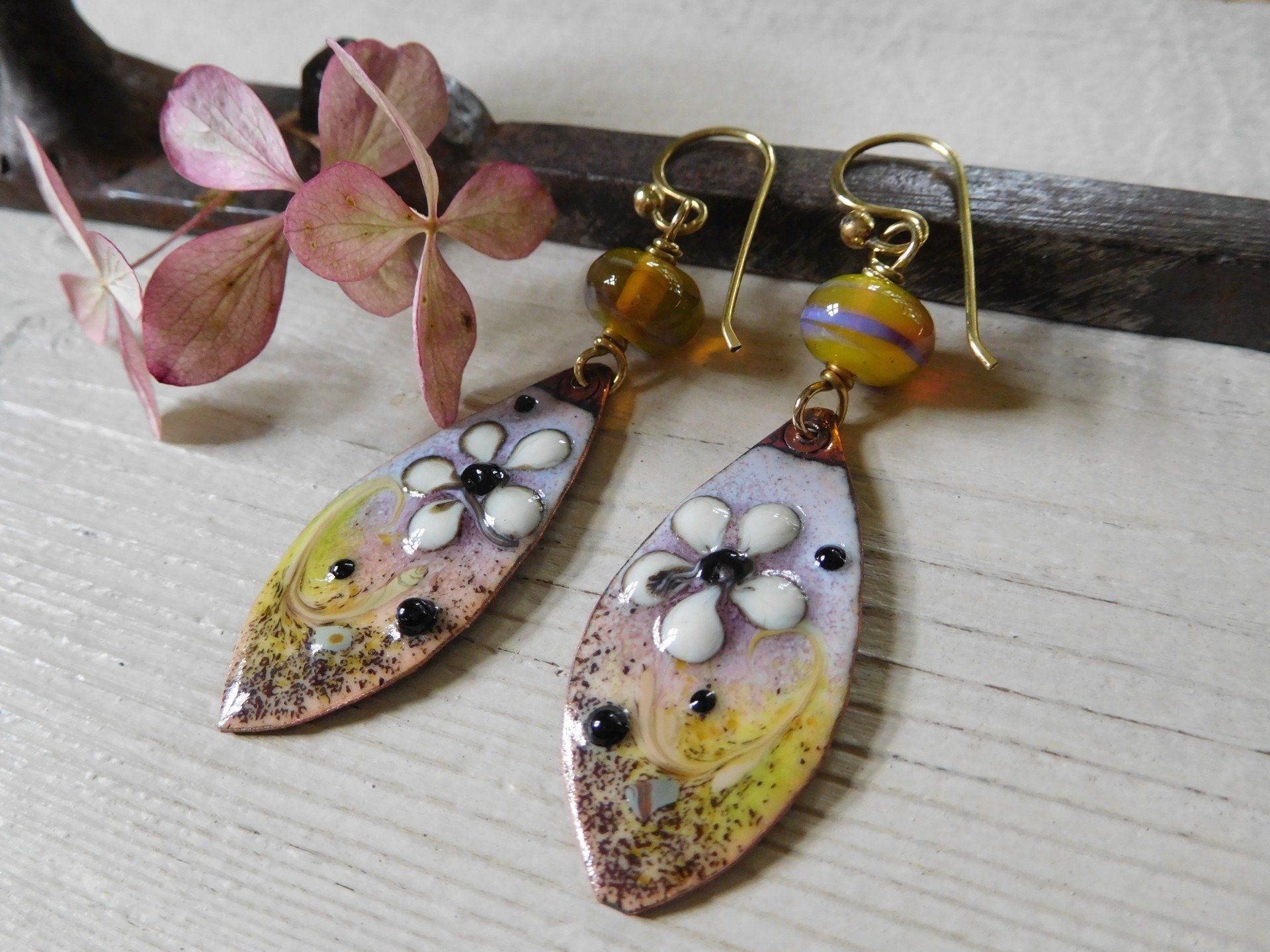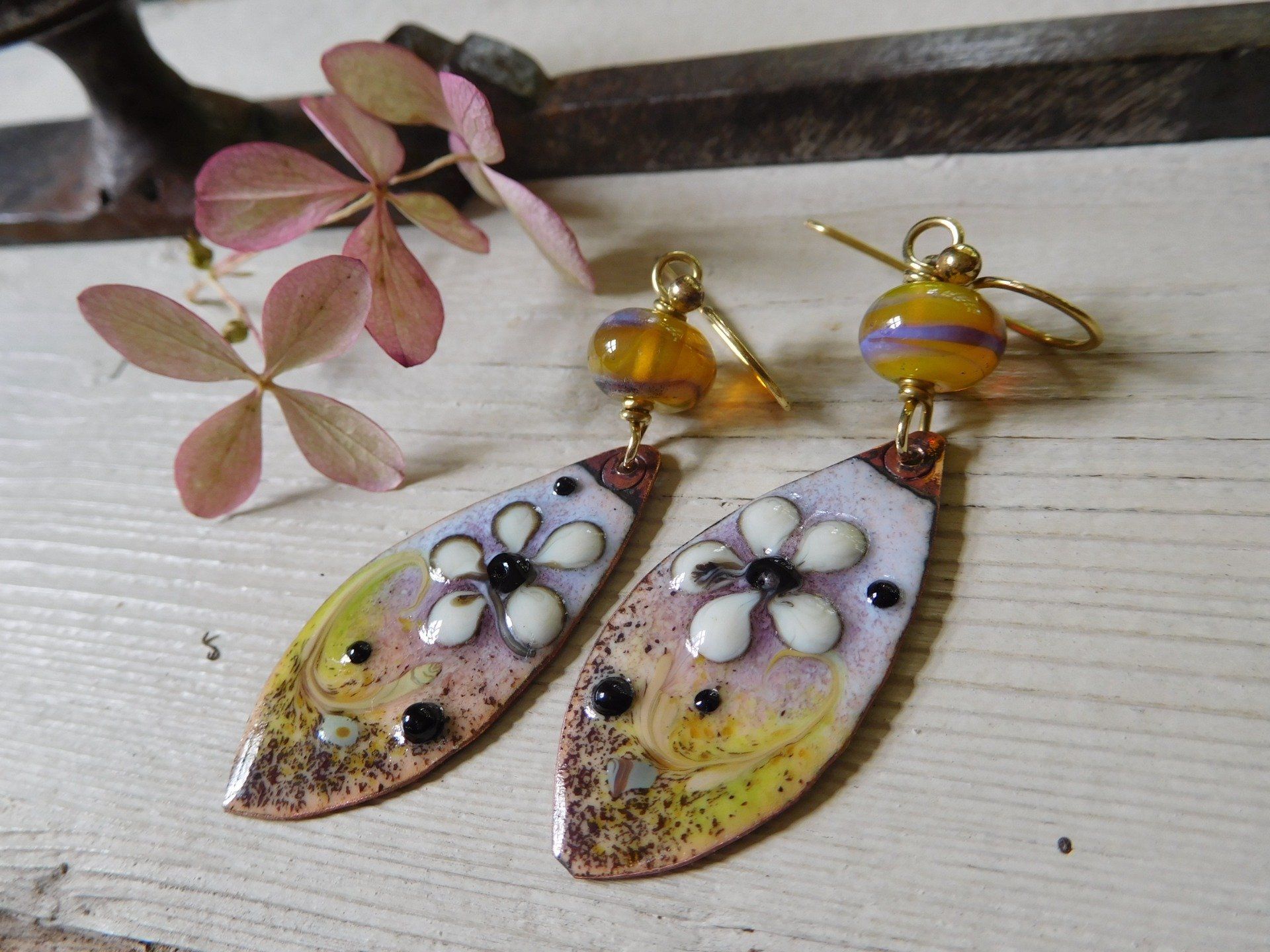 Boucles d'oreilles bohèmes en cuivre émaillé et perles en verre filé au chalumeau, modèle unique créé dans mon atelier en Finistère.