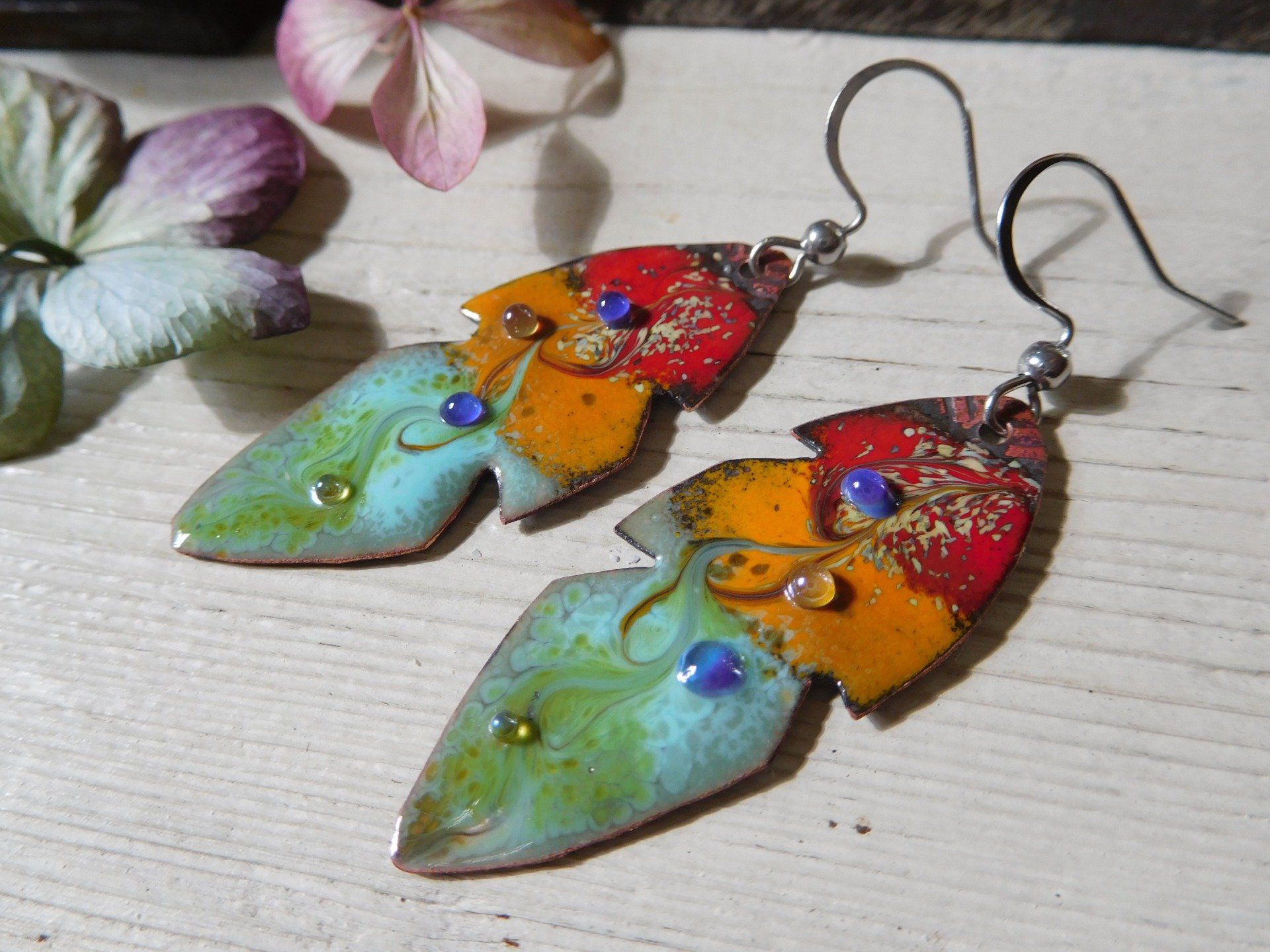 Boucles d'oreilles bohèmes en cuivre émaillé, modèle unique créé dans mon atelier en Finistère.