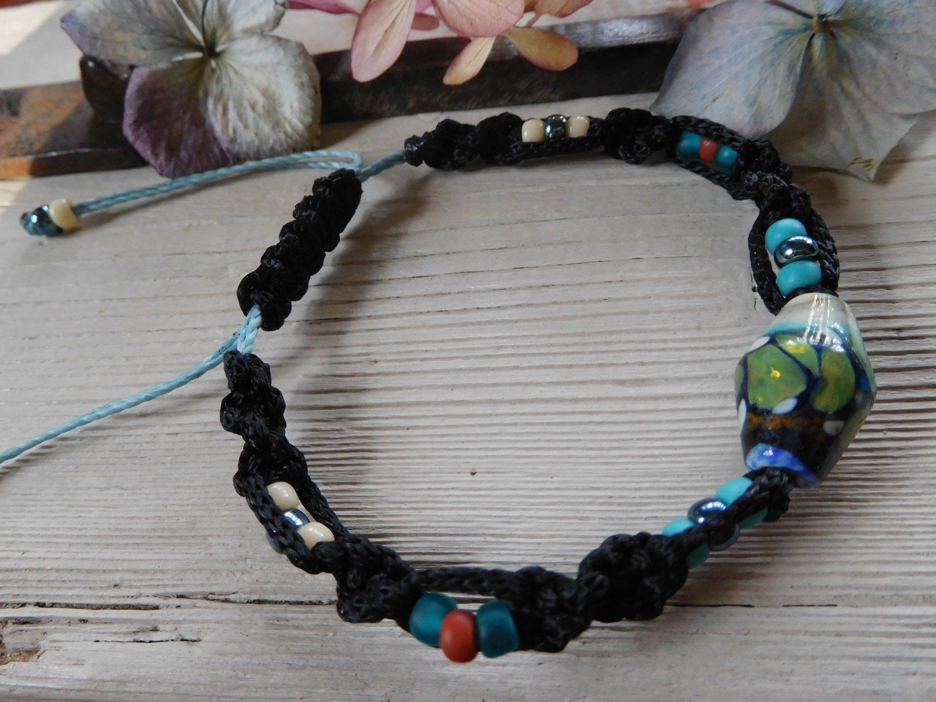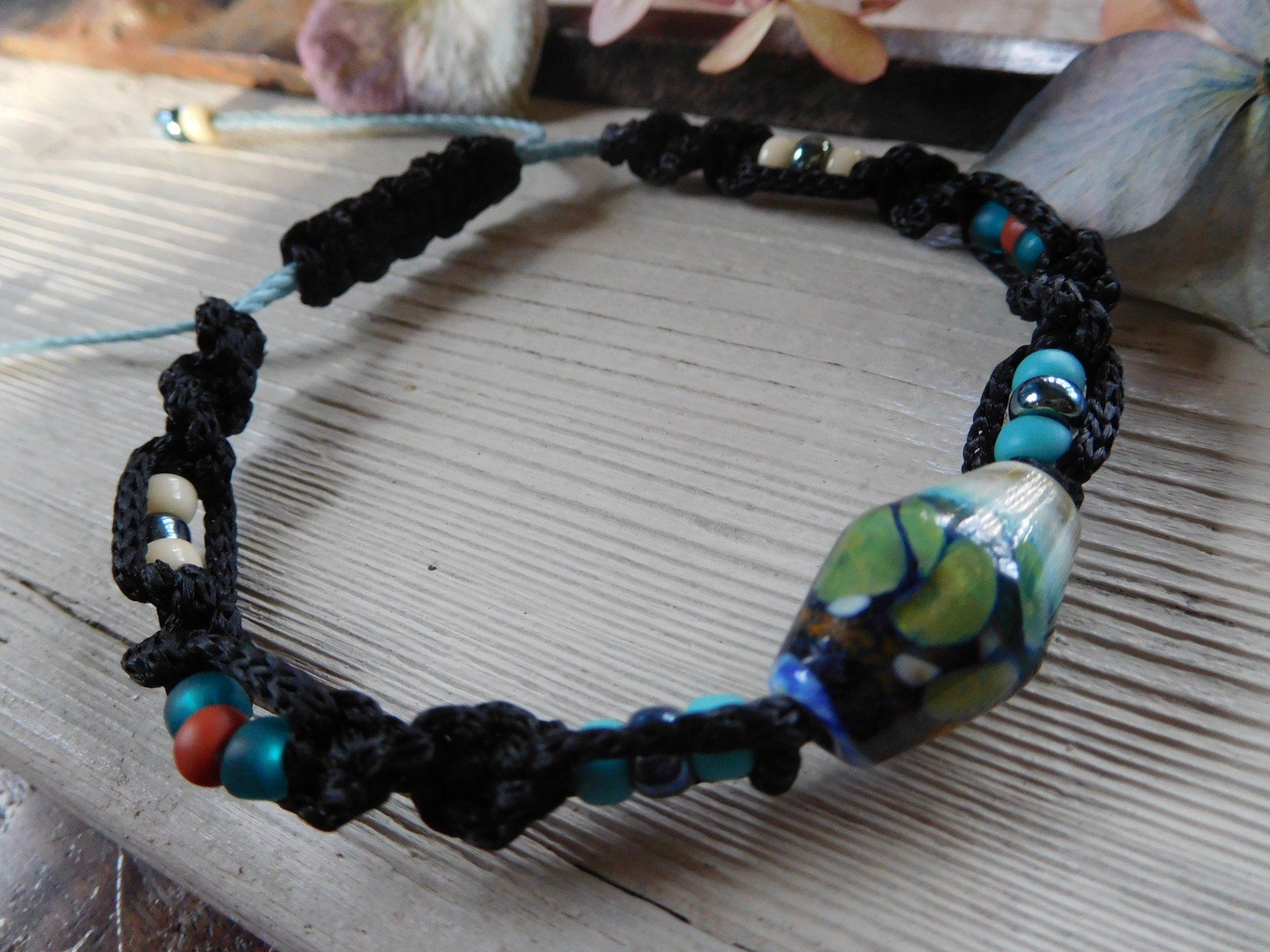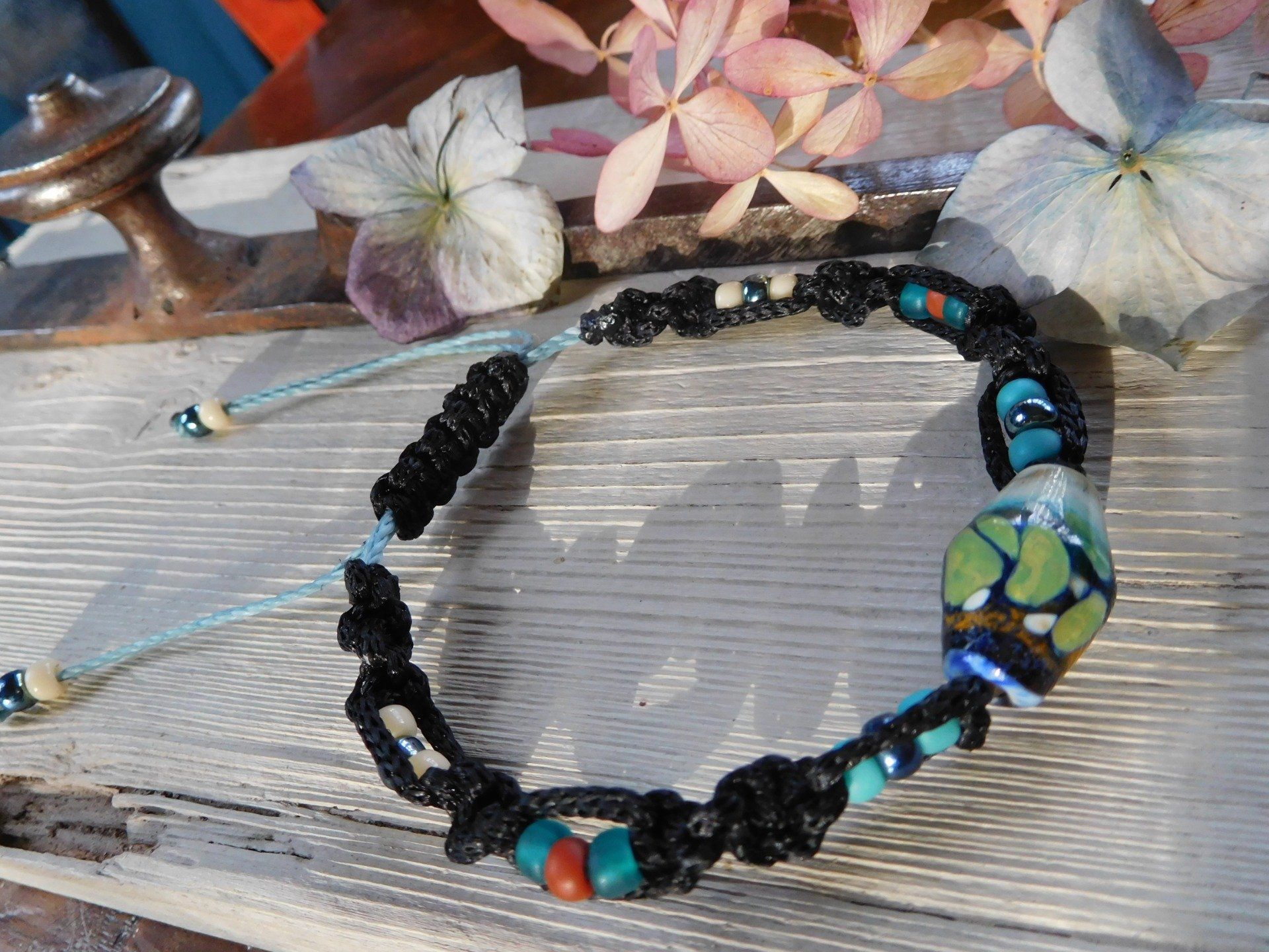 Ce bracelet macramé est composé d'une perle en verre filé au chalumeau créée dans mon atelier, de 22 perles miyki en verre.