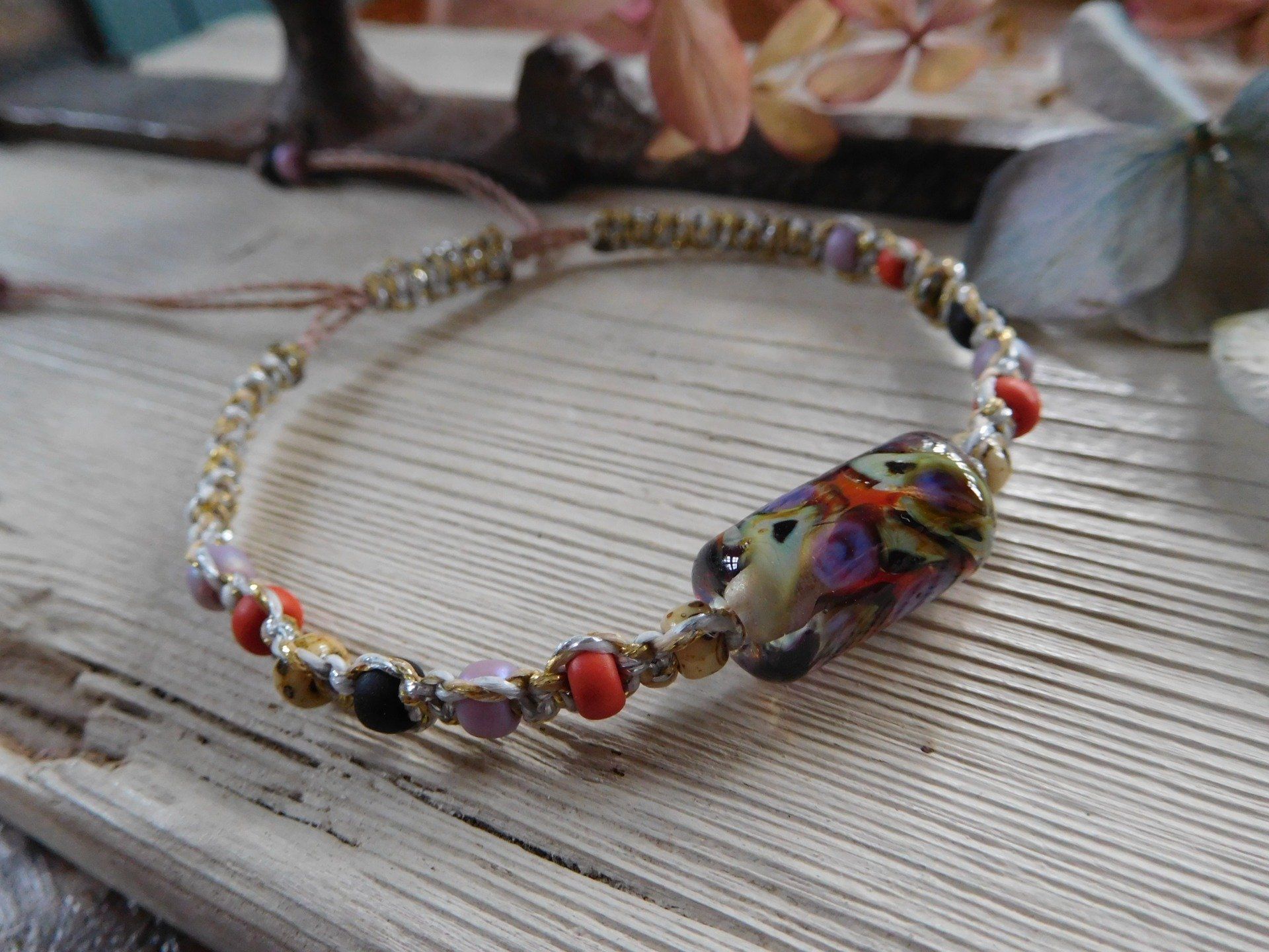 Ce bracelet macramé est composé d'une perle en verre filé au chalumeau créée dans mon atelier, de 18 perles miyuki en verre.