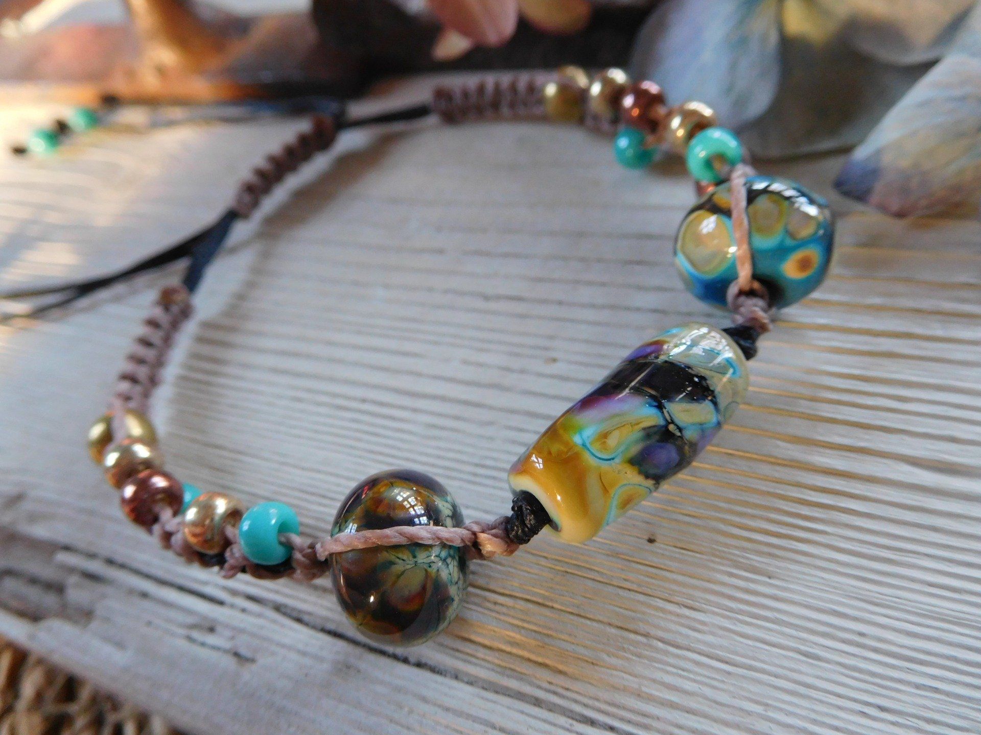 Ce bracelet macramé est composé de 3 perles en verre filé au chalumeau créée dans mon atelier, de 16 perles miyuki en verre et de 2 perles en laiton.