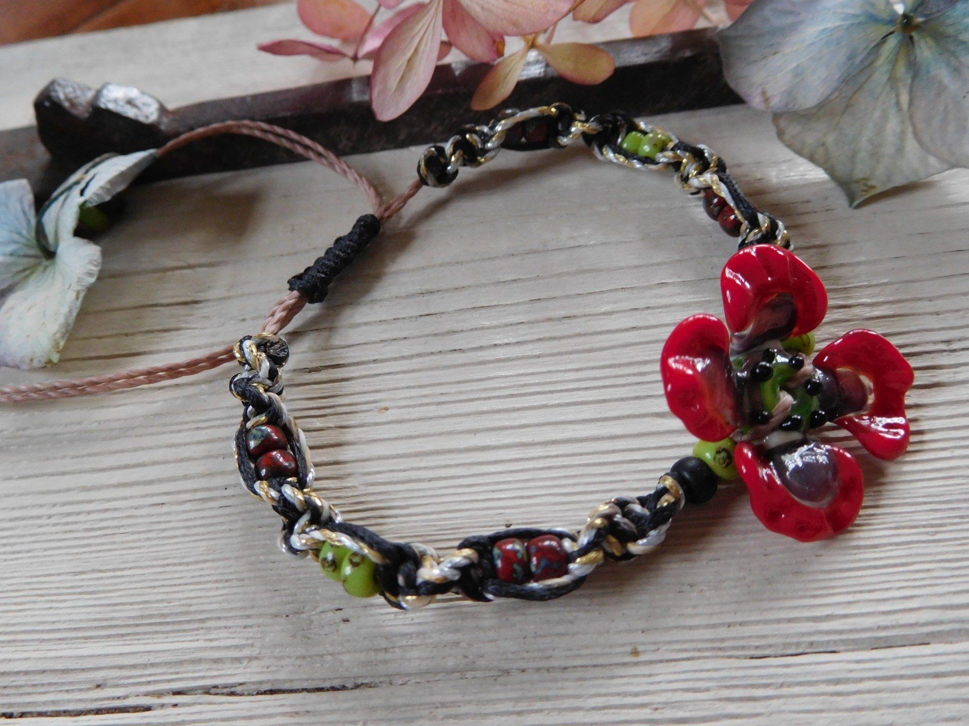 Ce bracelet macramé est composé d'une perle en forme de fleur en verre filé au chalumeau créée dans mon atelier, de 20 perles miyuki en verre.