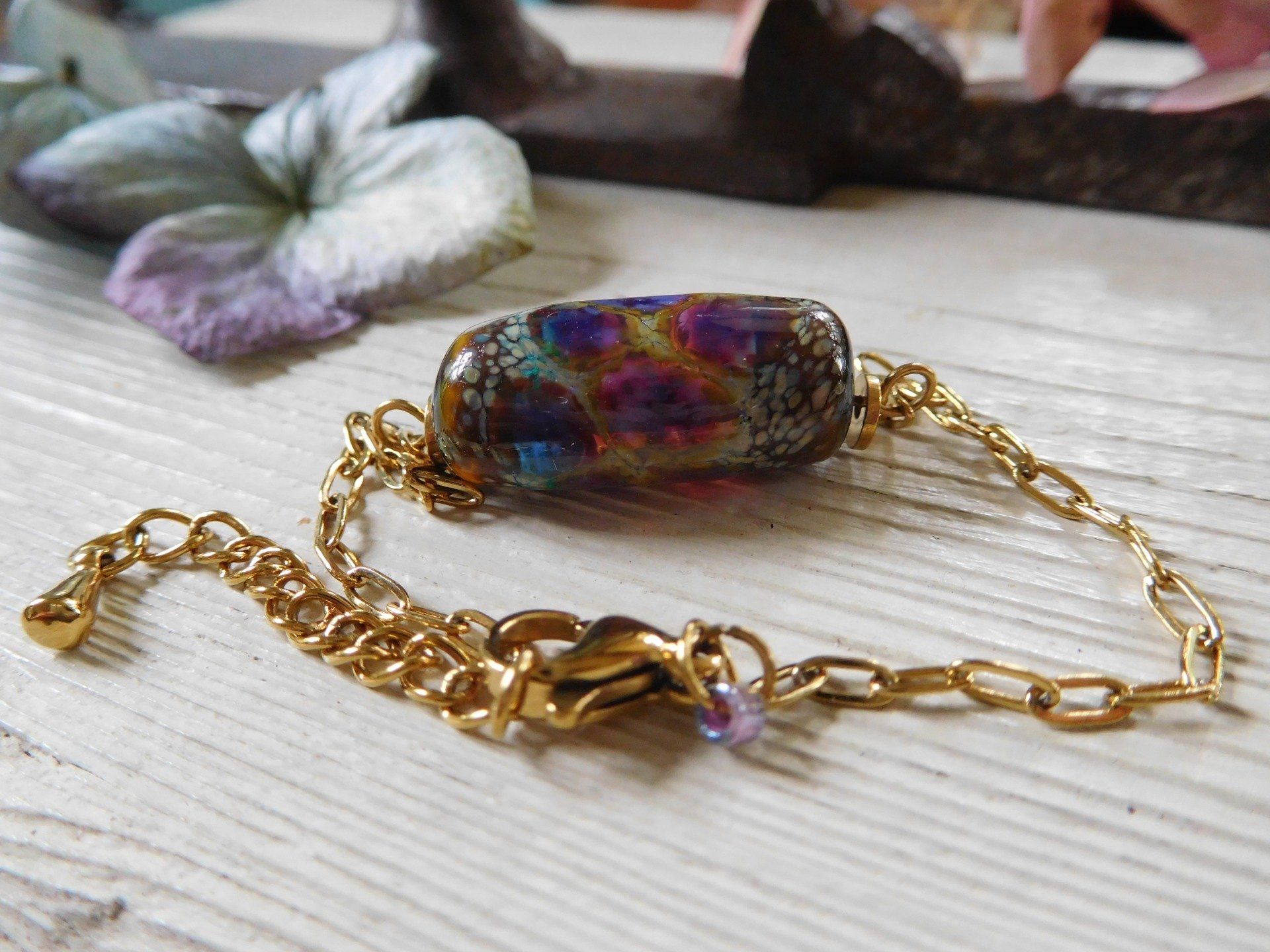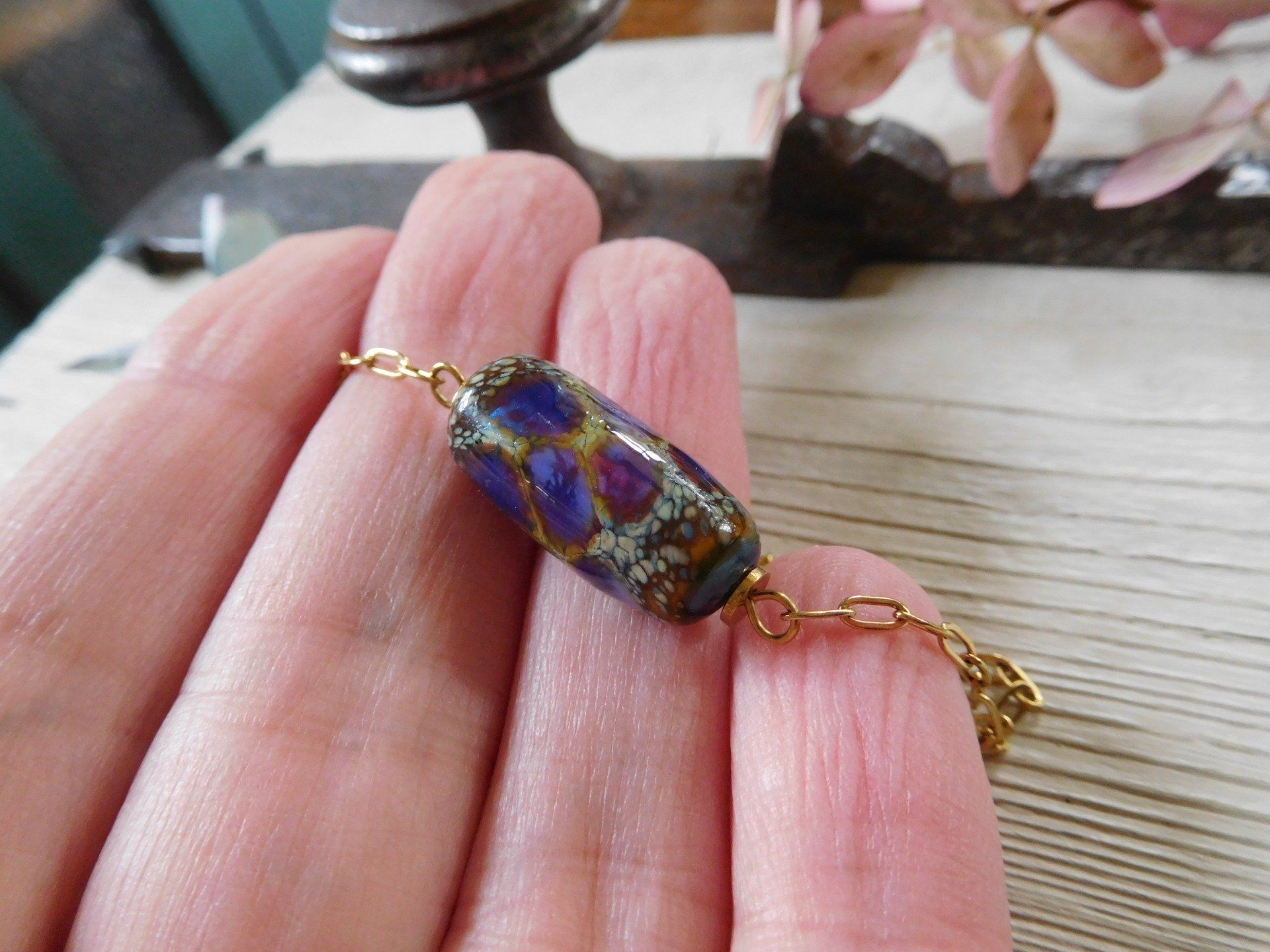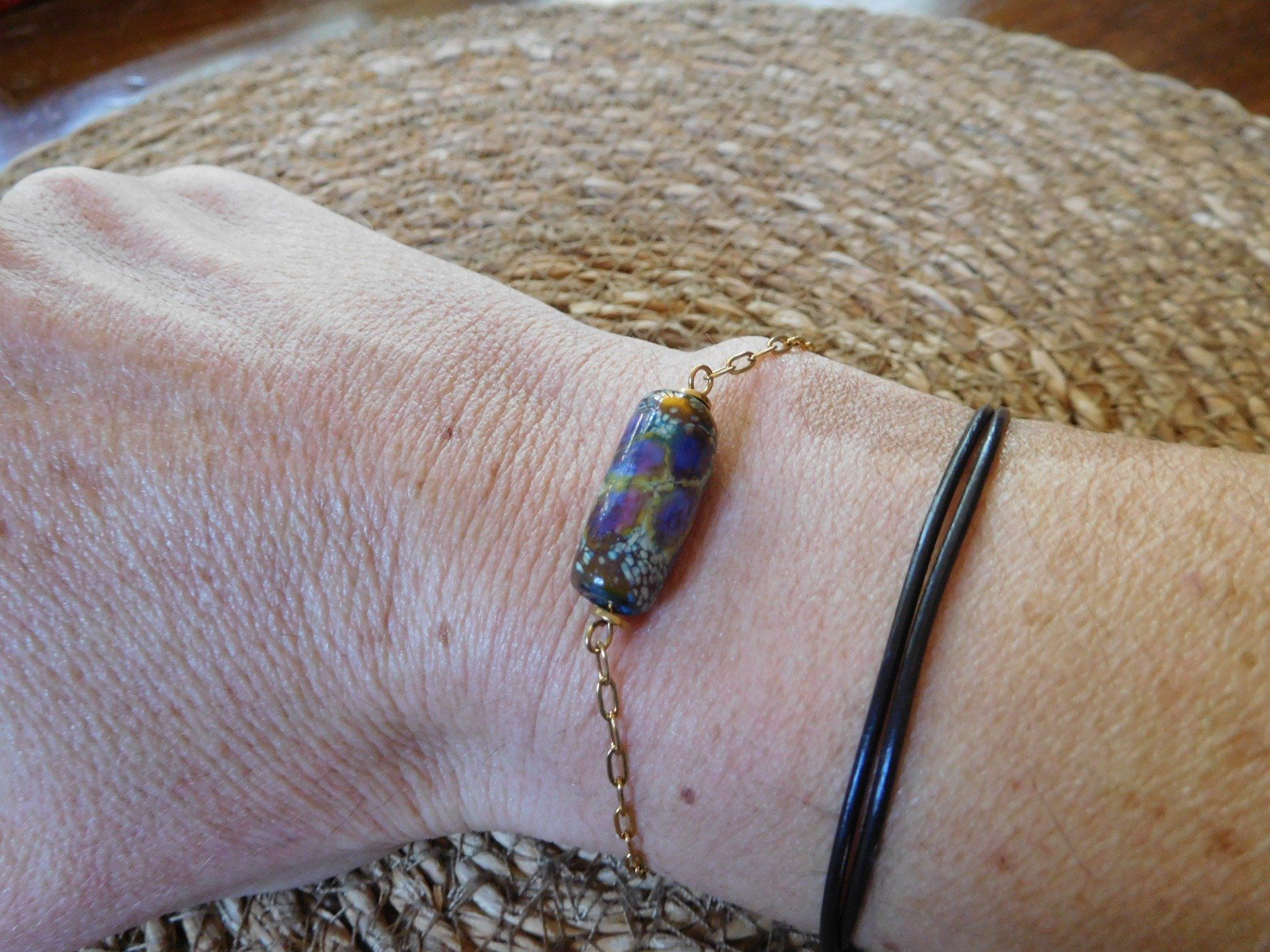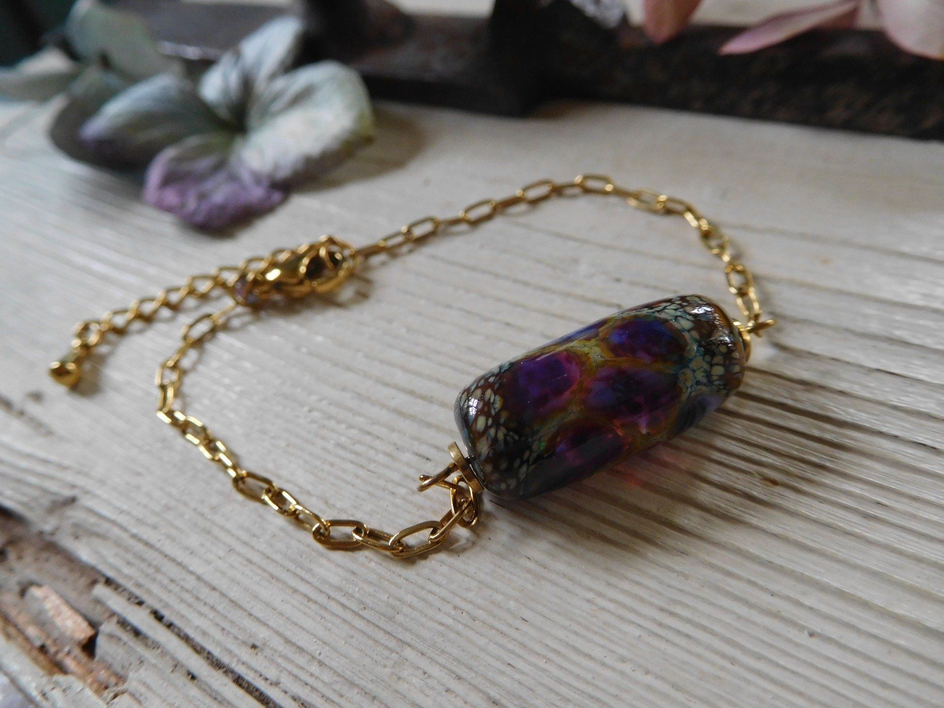 Bracelet chaîne "trombonne" en acier inox doré et perle en verre filé au chalumeau, créé dans mon atelier en Finistère, modèle unique.