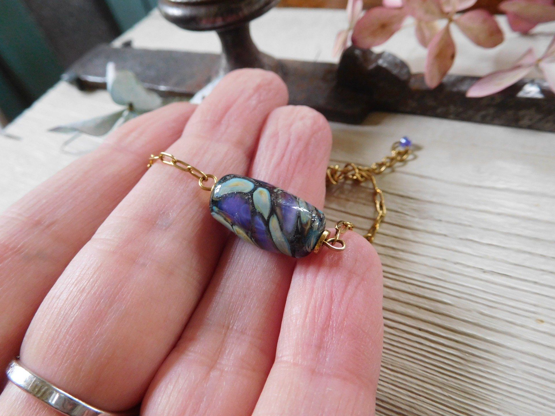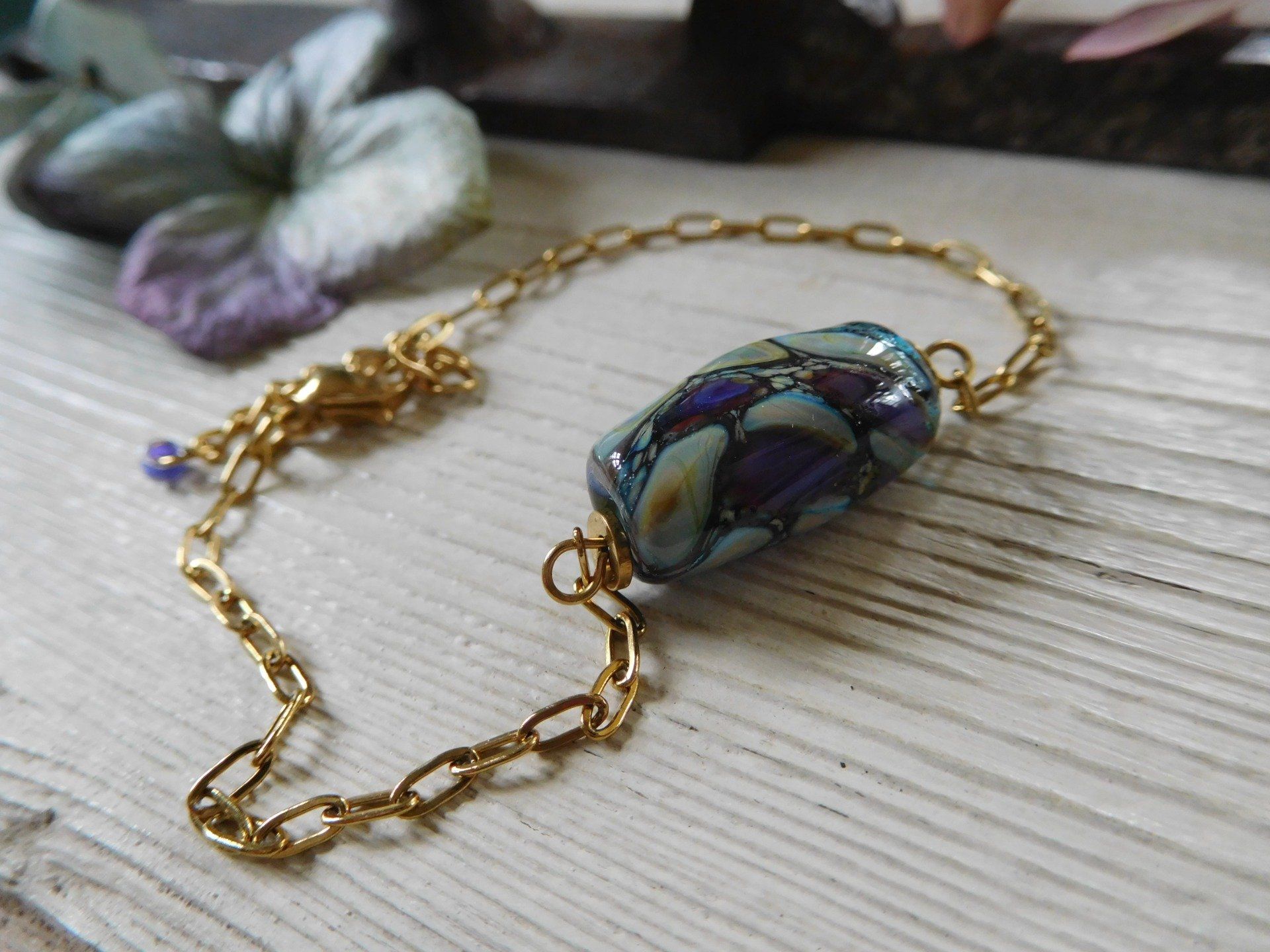 Bracelet chaîne "trombonne" en acier inox doré et perle en verre filé au chalumeau, créé dans mon atelier en Finistère, modèle unique.