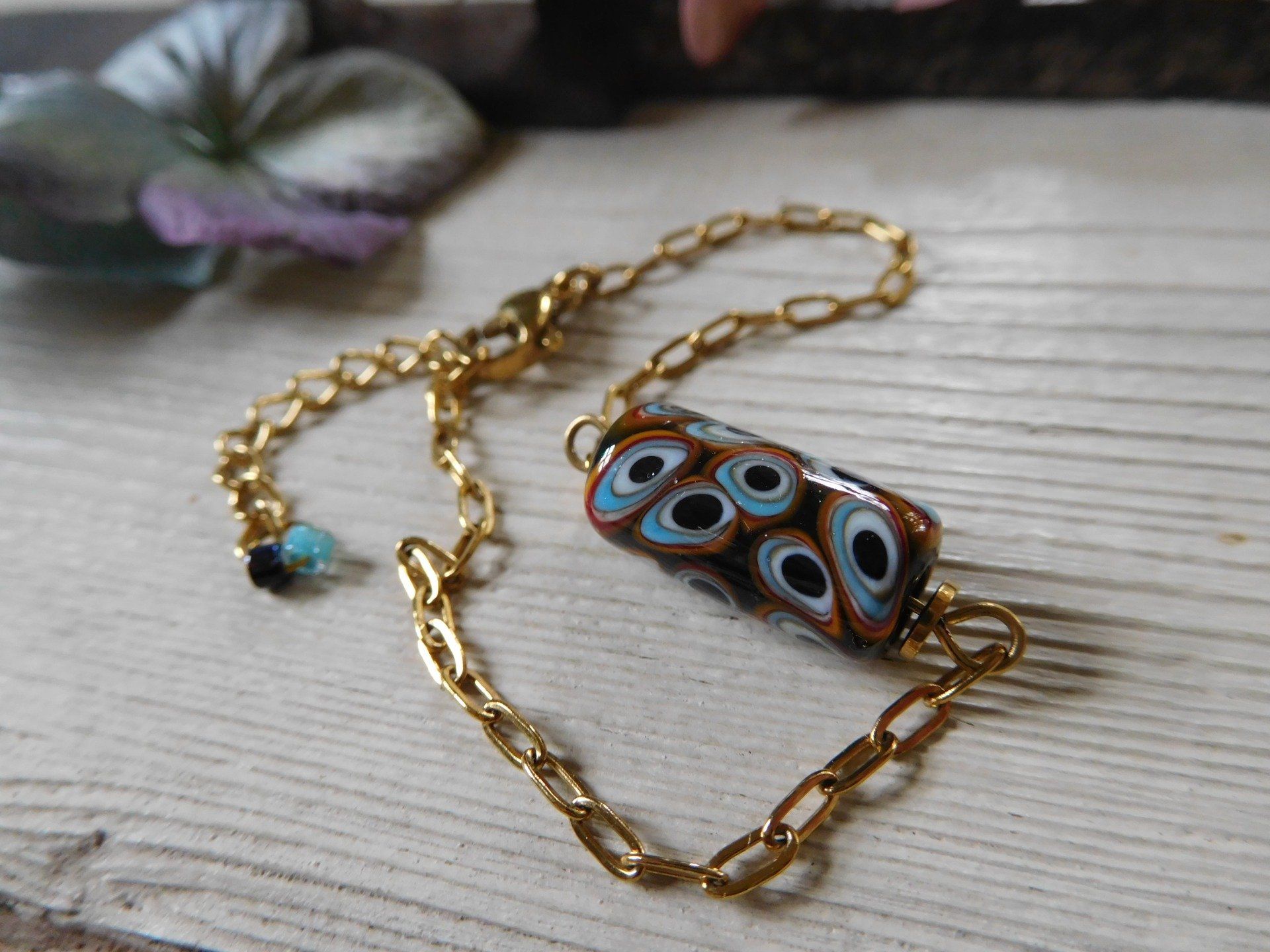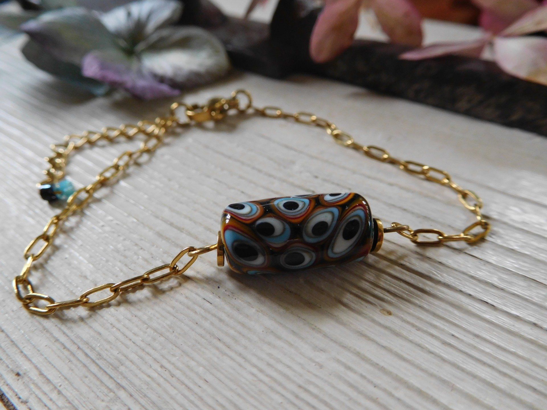 Bracelet chaîne "trombonne" en acier inox doré et perle en verre filé au chalumeau, créé dans mon atelier en Finistère, modèle unique.