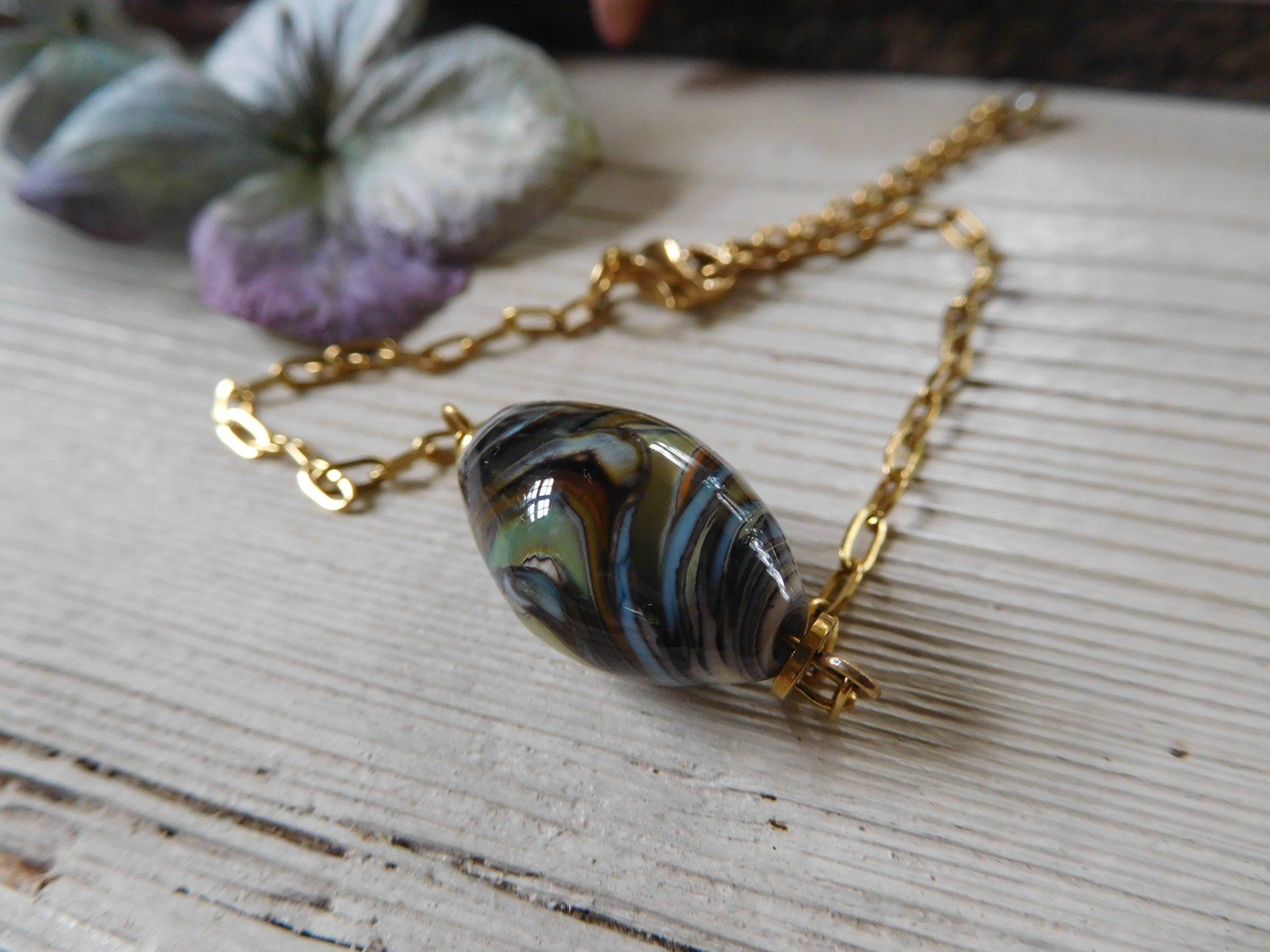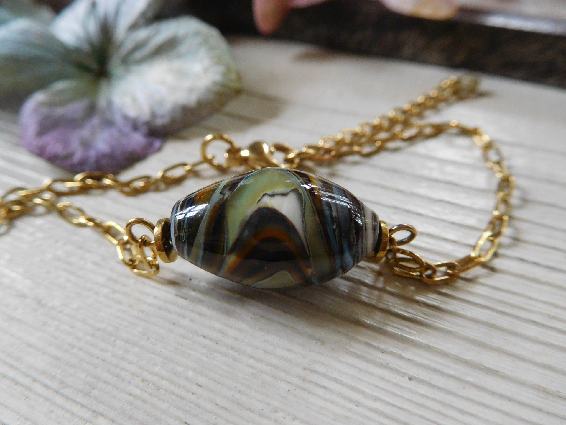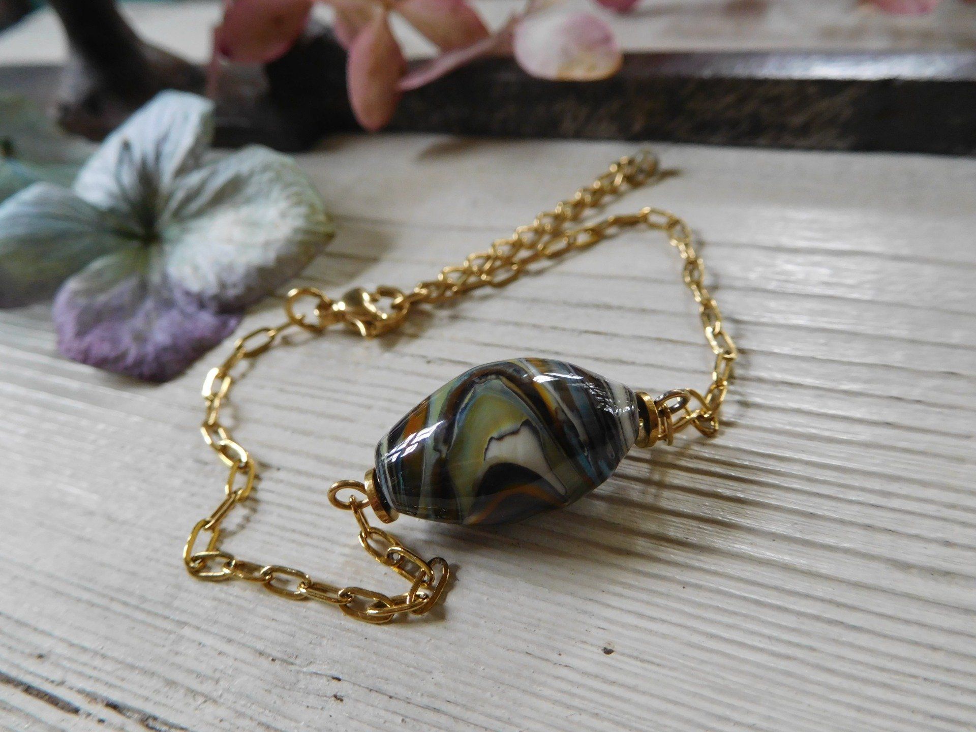 Bracelet chaîne "trombonne" en acier inox doré et perle en verre filé au chalumeau, créé dans mon atelier en Finistère, modèle unique.