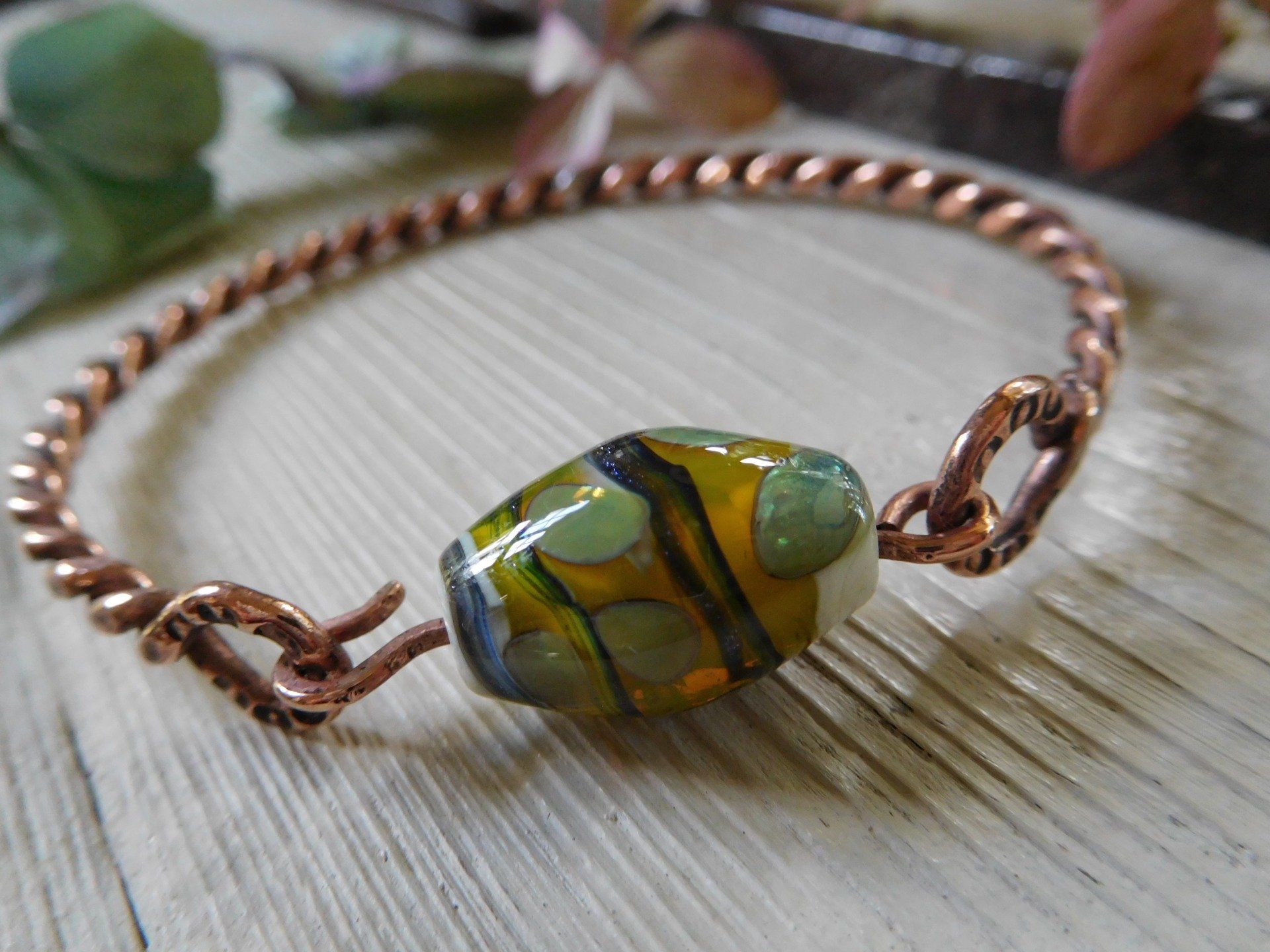 Il est composé d'une perle en verre filé au chalumeau créée elle aussi à l'atelier, la perle est insérée sur le fermoir en cuivre.