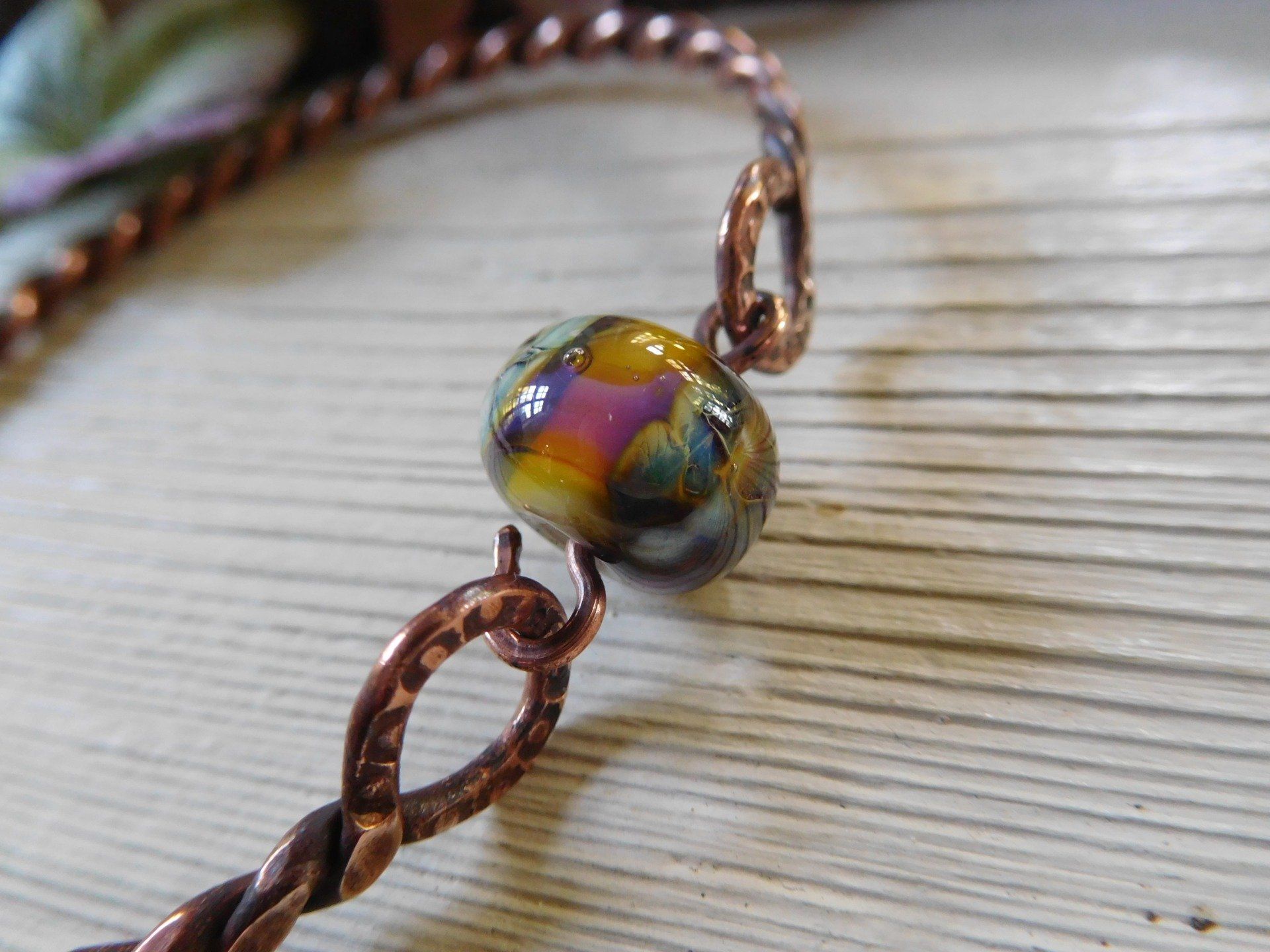 Il est composé d'une perle en verre filé au chalumeau créée elle aussi à l'atelier, la perle est insérée sur le fermoir en cuivre.