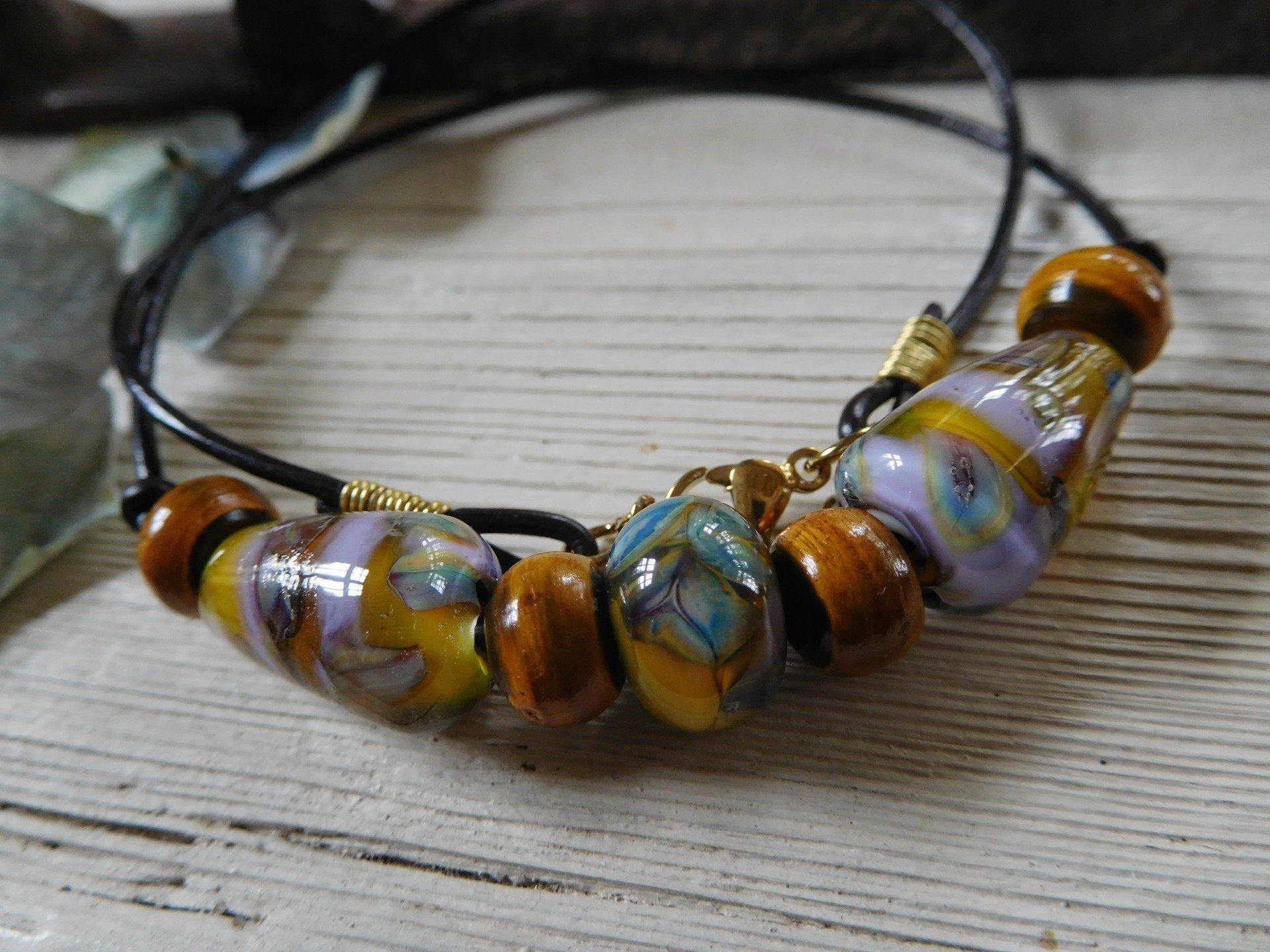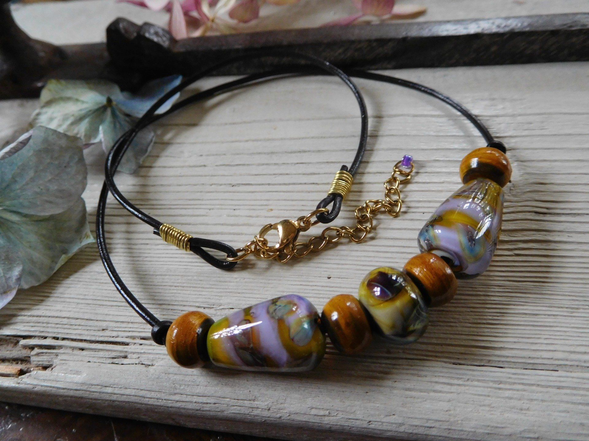 Ce collier ras de cou est composé d'un cordon en cuir noir de 1.5 mm de diamètre, de trois perles en verre filé au chalumeau créées dans mon atelier, de quatre perles en bois, le fermoir mousqueton et la chaîne de rallonge sont en acier inox doré. Les attaches à la fin du cordon cuir sont en fil laiton.