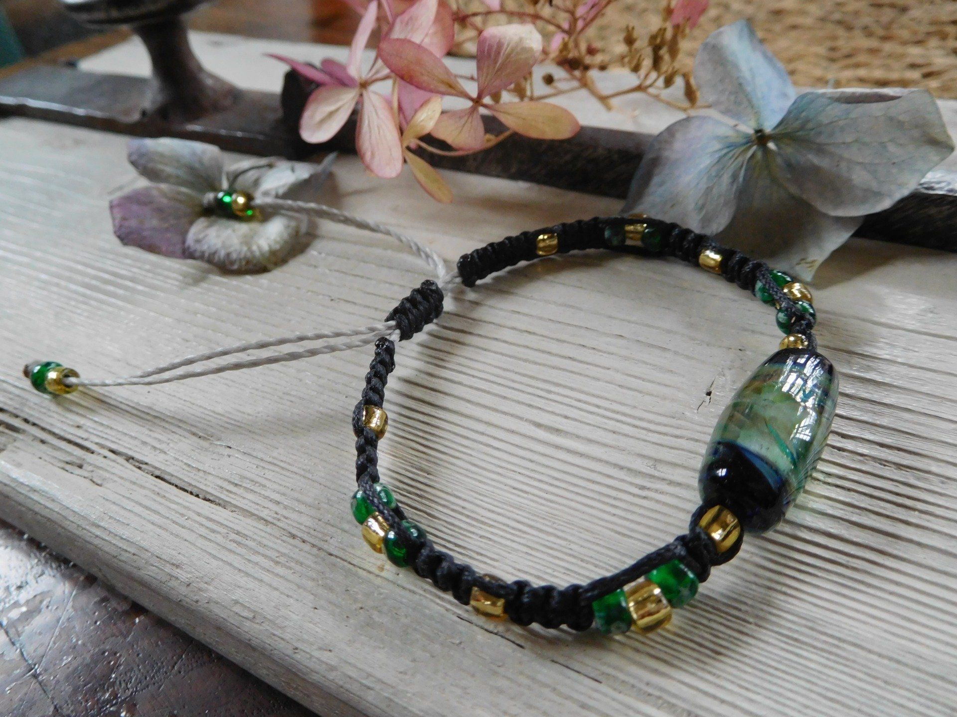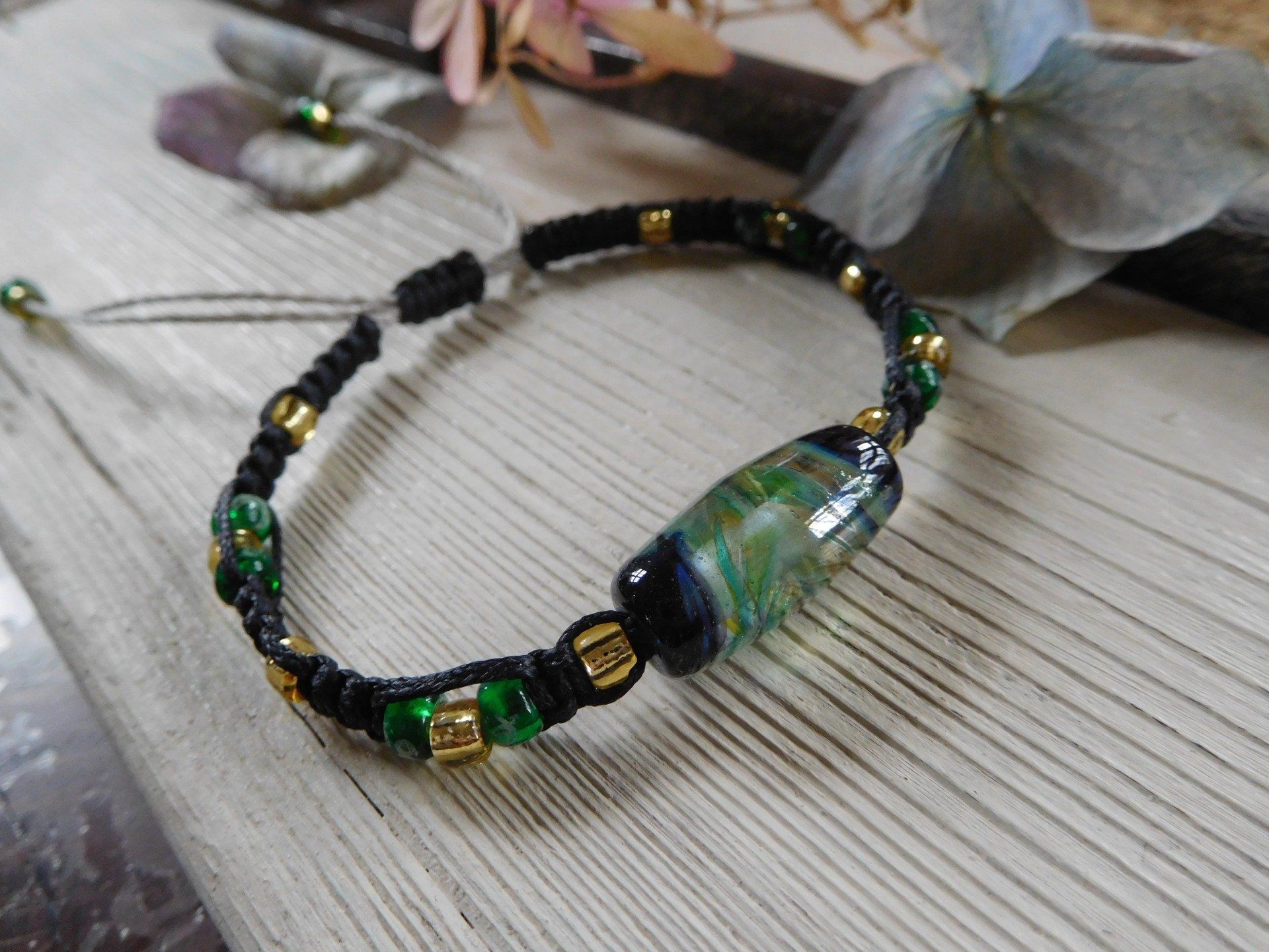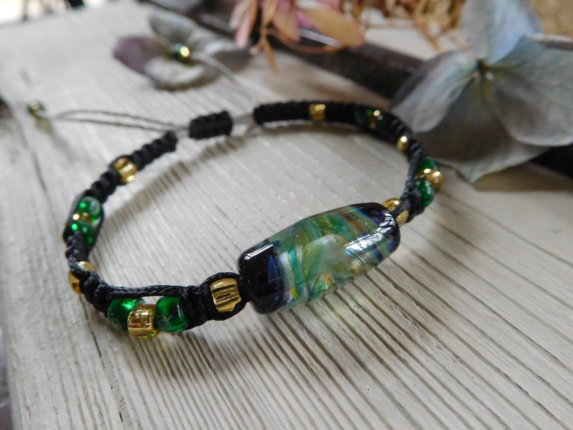 Ce bracelet macramé est composé d'une perle en verre filé au chalumeau créée dans mon atelier, de 22 perles miyuki en verre.