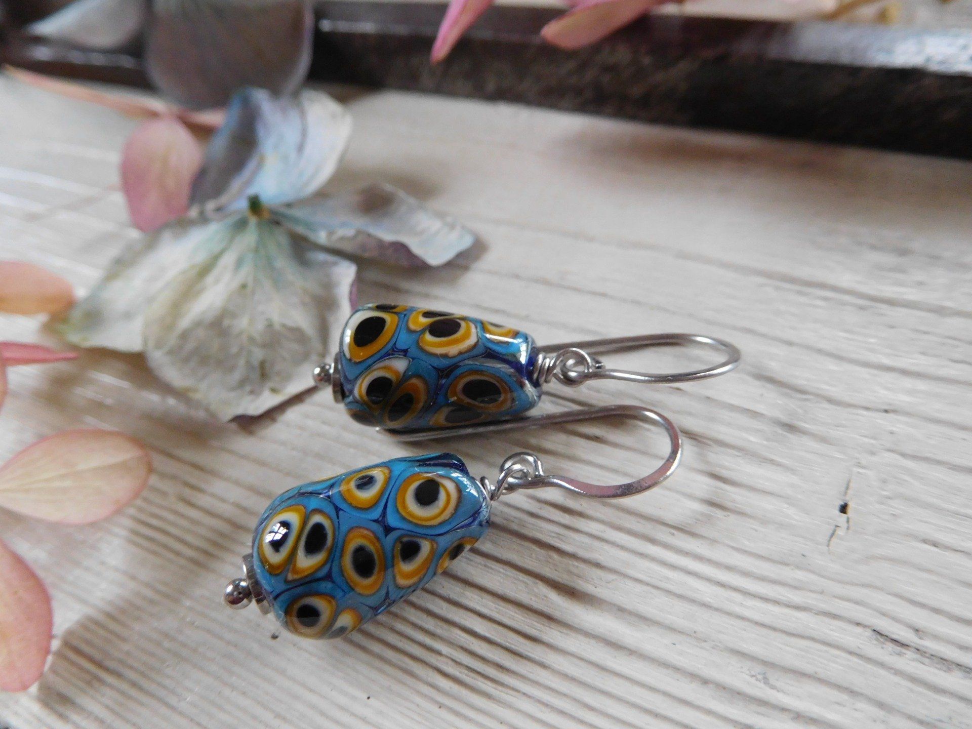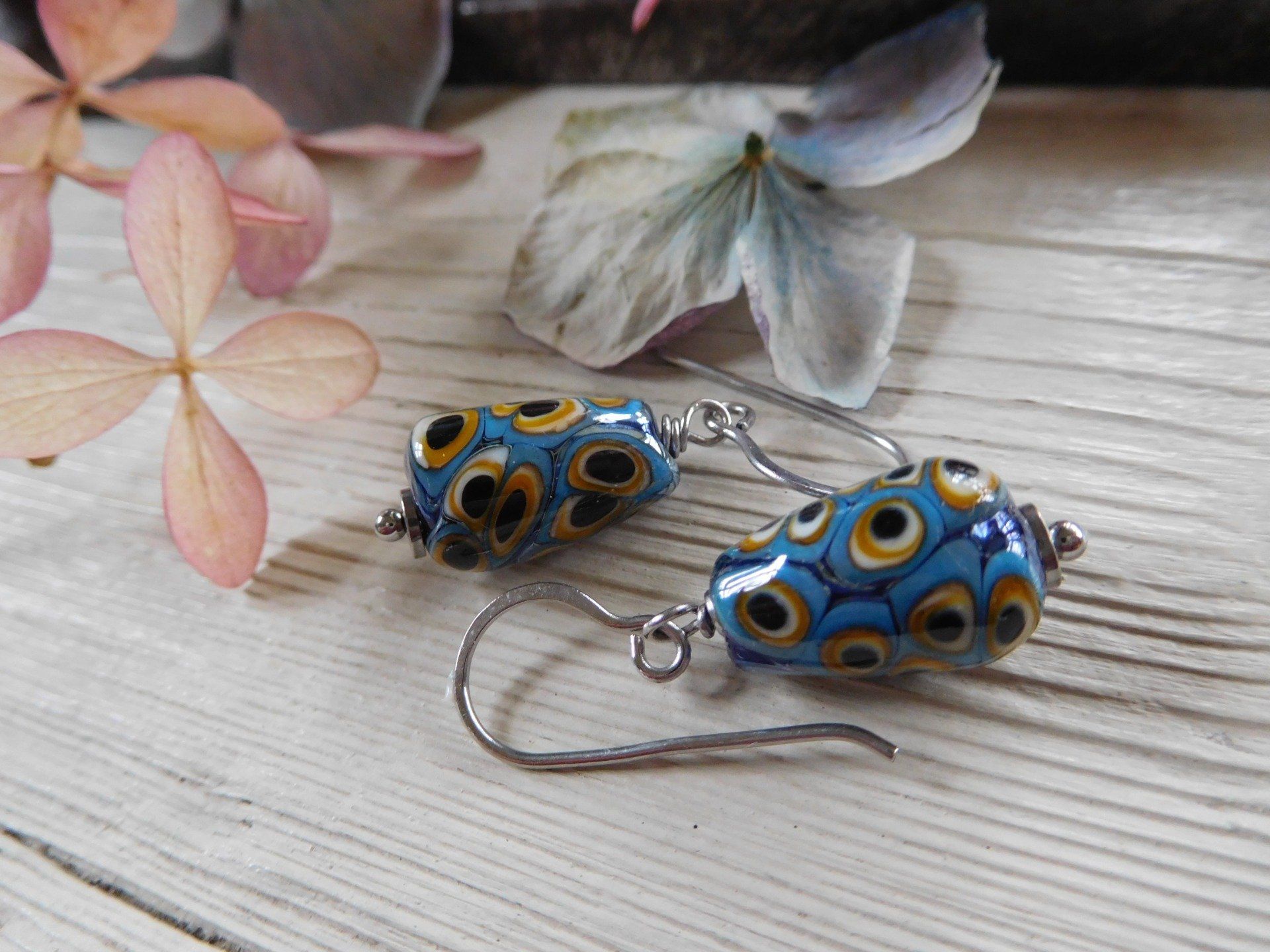 Boucles d'oreilles bohèmes avec perles en verre filé au chalumeau, modèle unique créé dans mon atelier en Finistère.