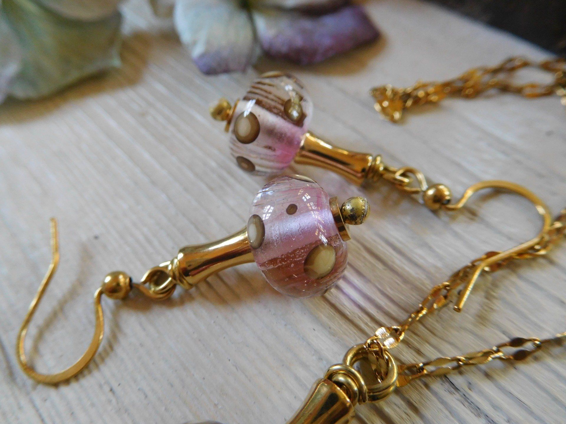 Parure boucles d'oreilles bohèmes et pendentif avec perles en verre filé au chalumeau, modèle unique créé dans mon atelier en Finistère.