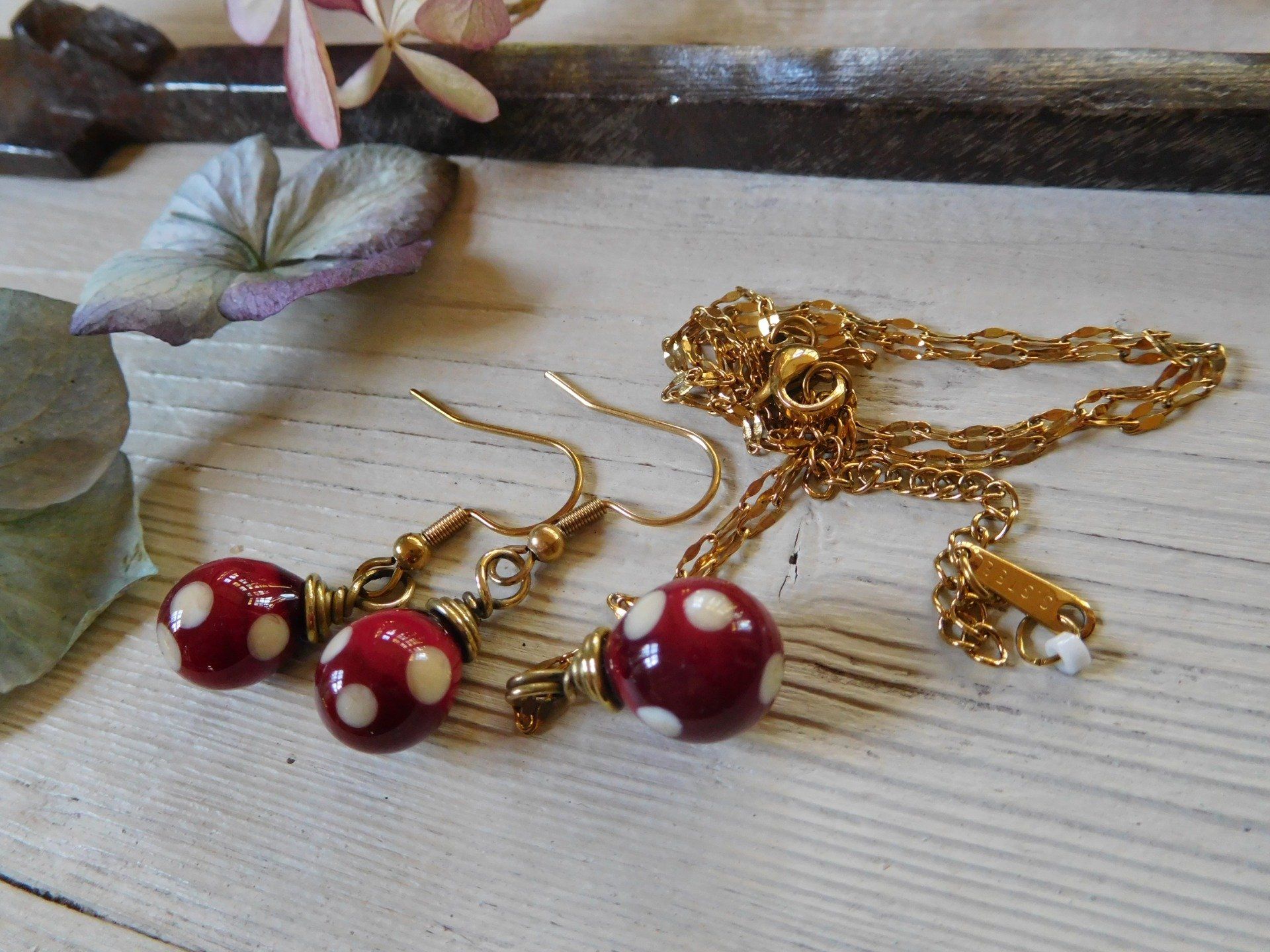 Parure boucles d'oreilles bohèmes et pendentif avec perles en verre filé au chalumeau, modèle unique créé dans mon atelier en Finistère.