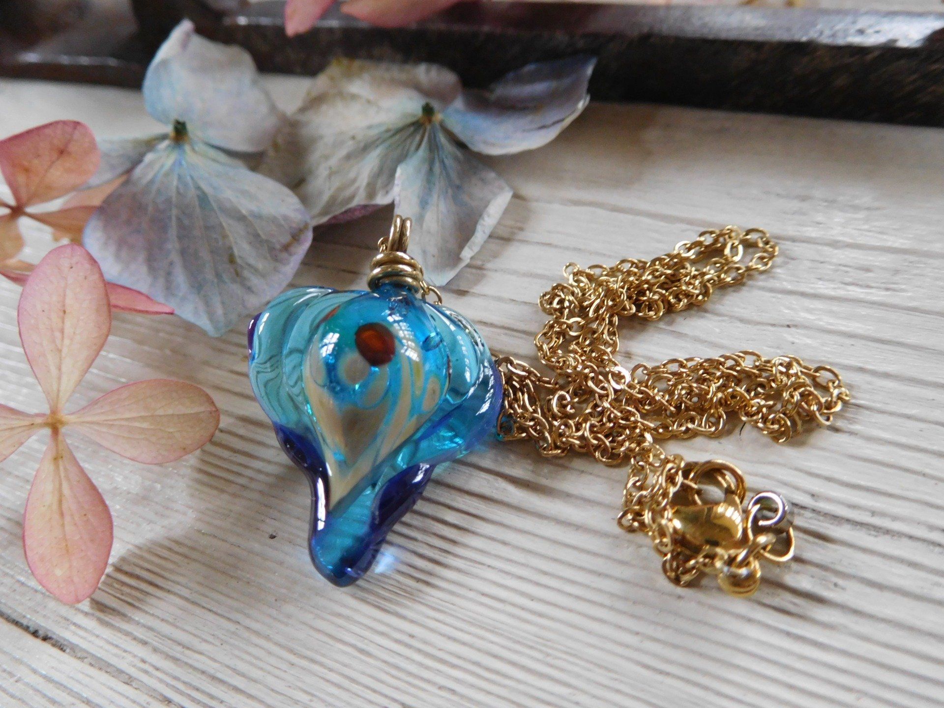 Pendentif perle en verre filé au chalumeau sur chaîne en acier inox doré, créé dans mon atelier en Finistère, modèle unique.