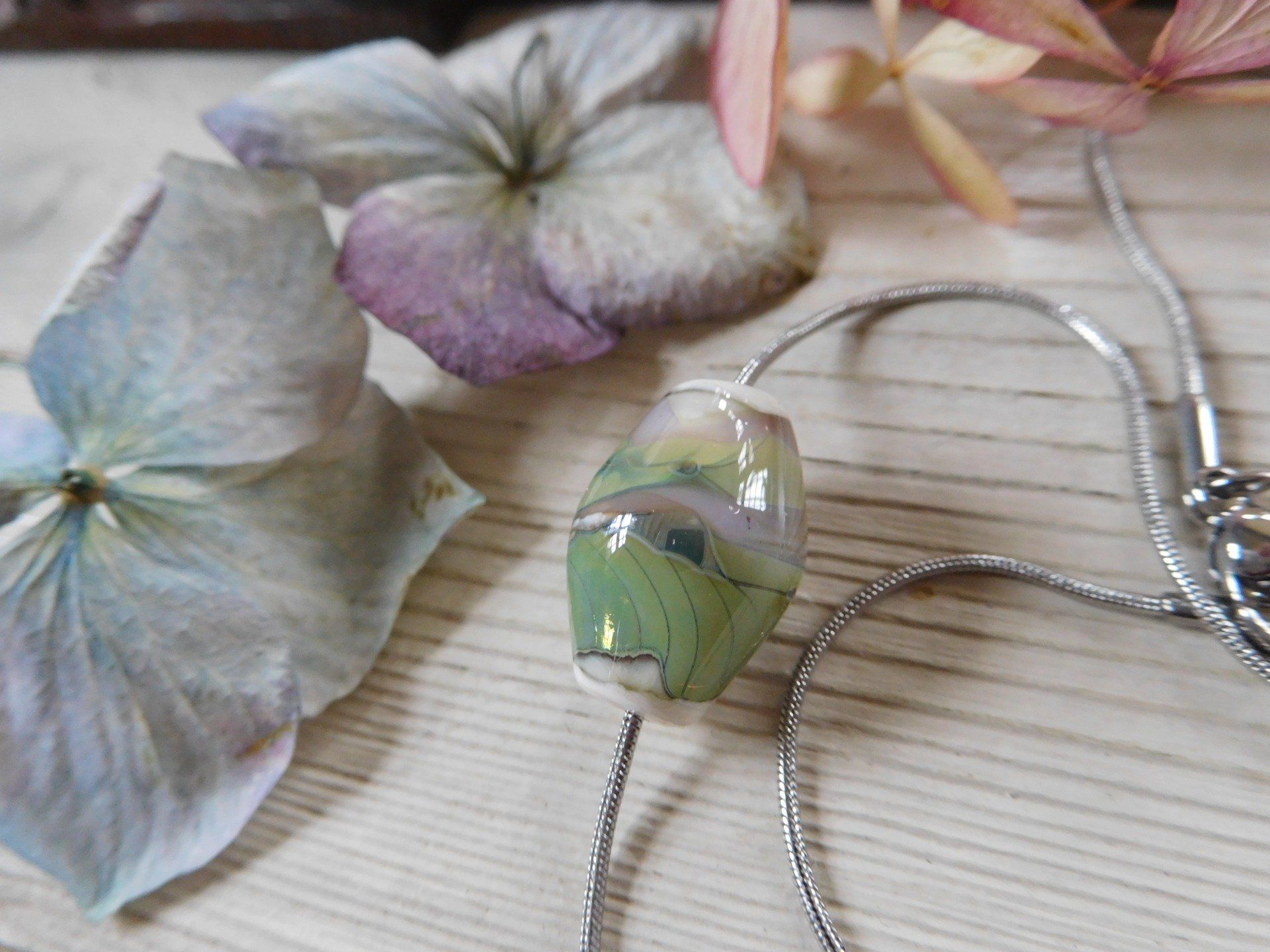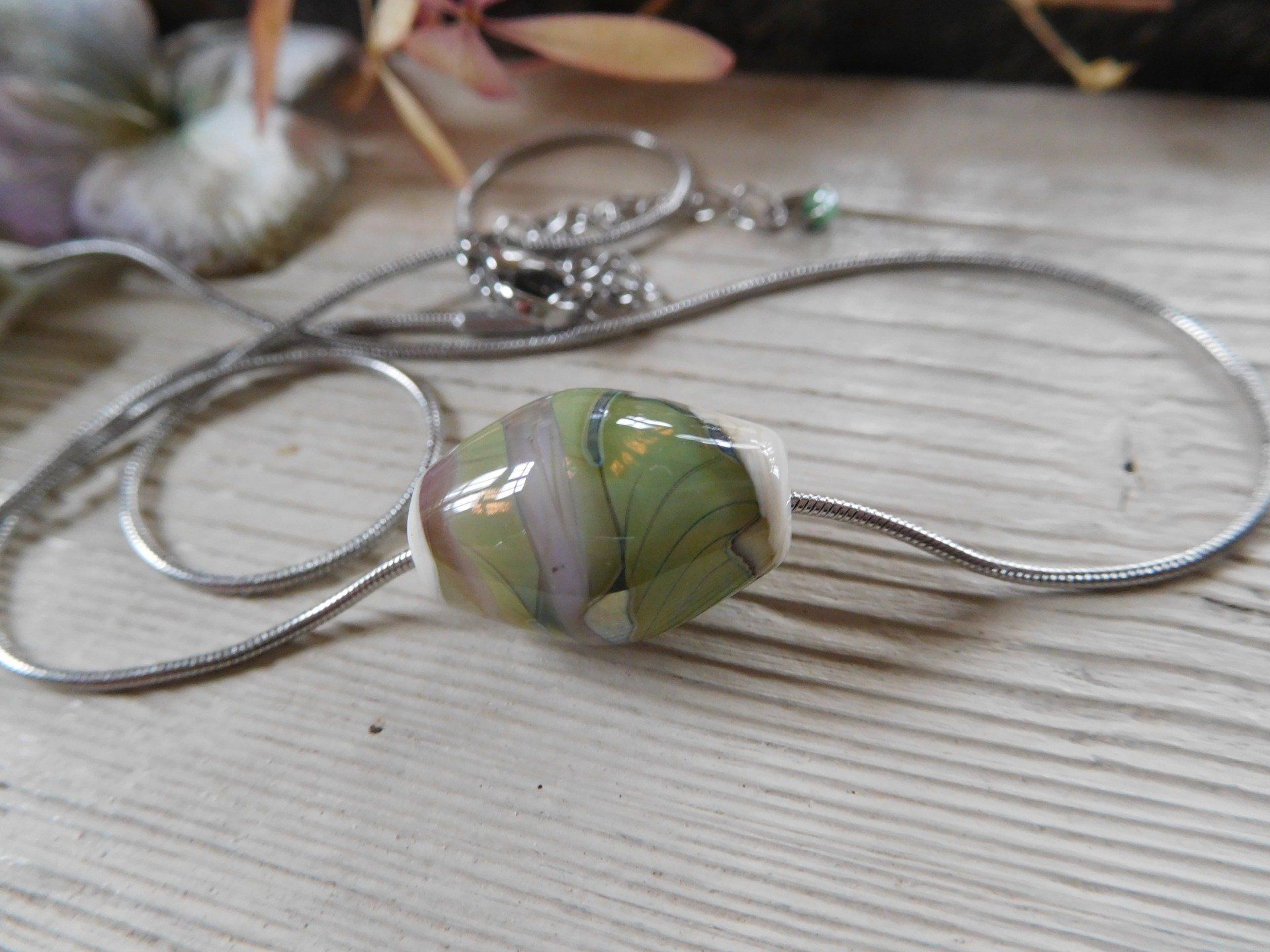 Pendentif perle en verre filé au chalumeau sur chaîne fine en acier inox argenté, créé dans mon atelier en Finistère, modèle unique.